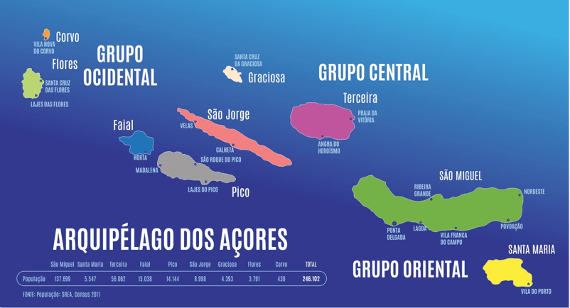 São Miguel, a maior das ilhas – tem 759,41 km² de superfície, o comprimento é de 65 km e a largura de 14 Km, com 137.300 habitantes o que corresponde a cerca de metade de toda a população do arquipélago e o Corvo, a mais pequena tem apenas 17 km²  com cerca de 400 pessoas.