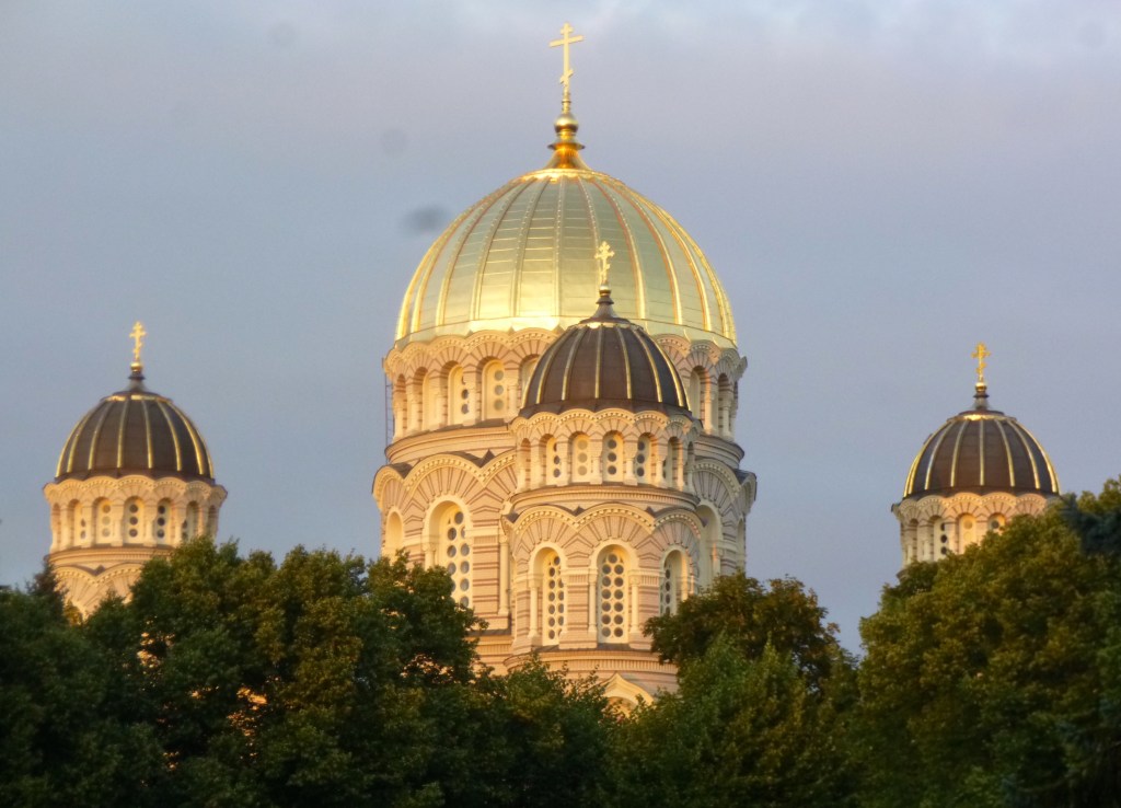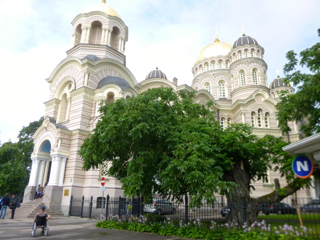 com 42 metros de altura, é um poderoso símbolo da independência letã. A base em granito é decorada com estátuas que representam as 4 virtudes: trabalho, vida espiritual, família e proteção. Chegados aí decidimos avançar até ao Parque Esplanade com o intuito de apreciarmos mais de perto a Catedral Ortodoxa – neobizantina russa, é uma interessante estrutura encimada por cinco cúpulas. O seu exterior e interior são de uma beleza impressionante. (atenção: dentro das igrejas ortodoxas russas não é permitido fotografar !) A foto da direita é só da entrada!