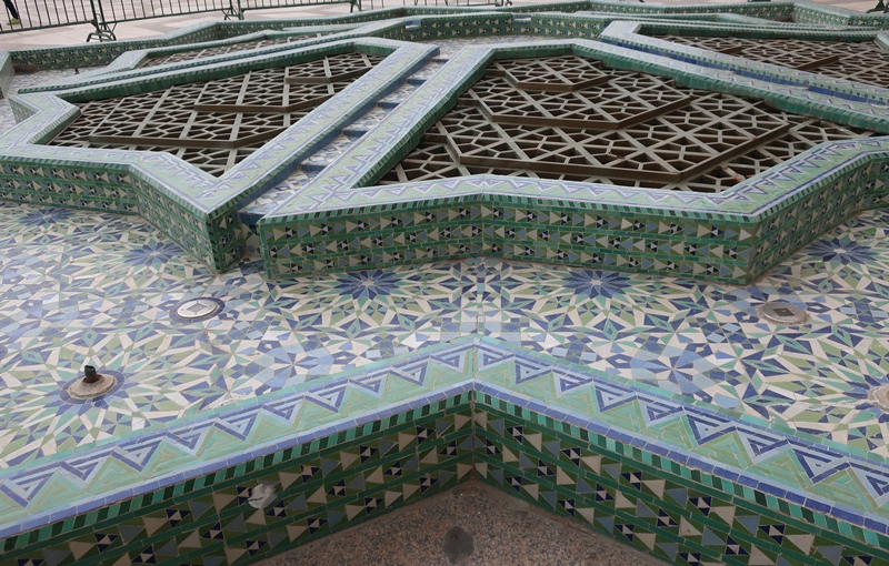 as fontes com um trabalhado minucioso de azulejos e de arcos e colunas em mármore,