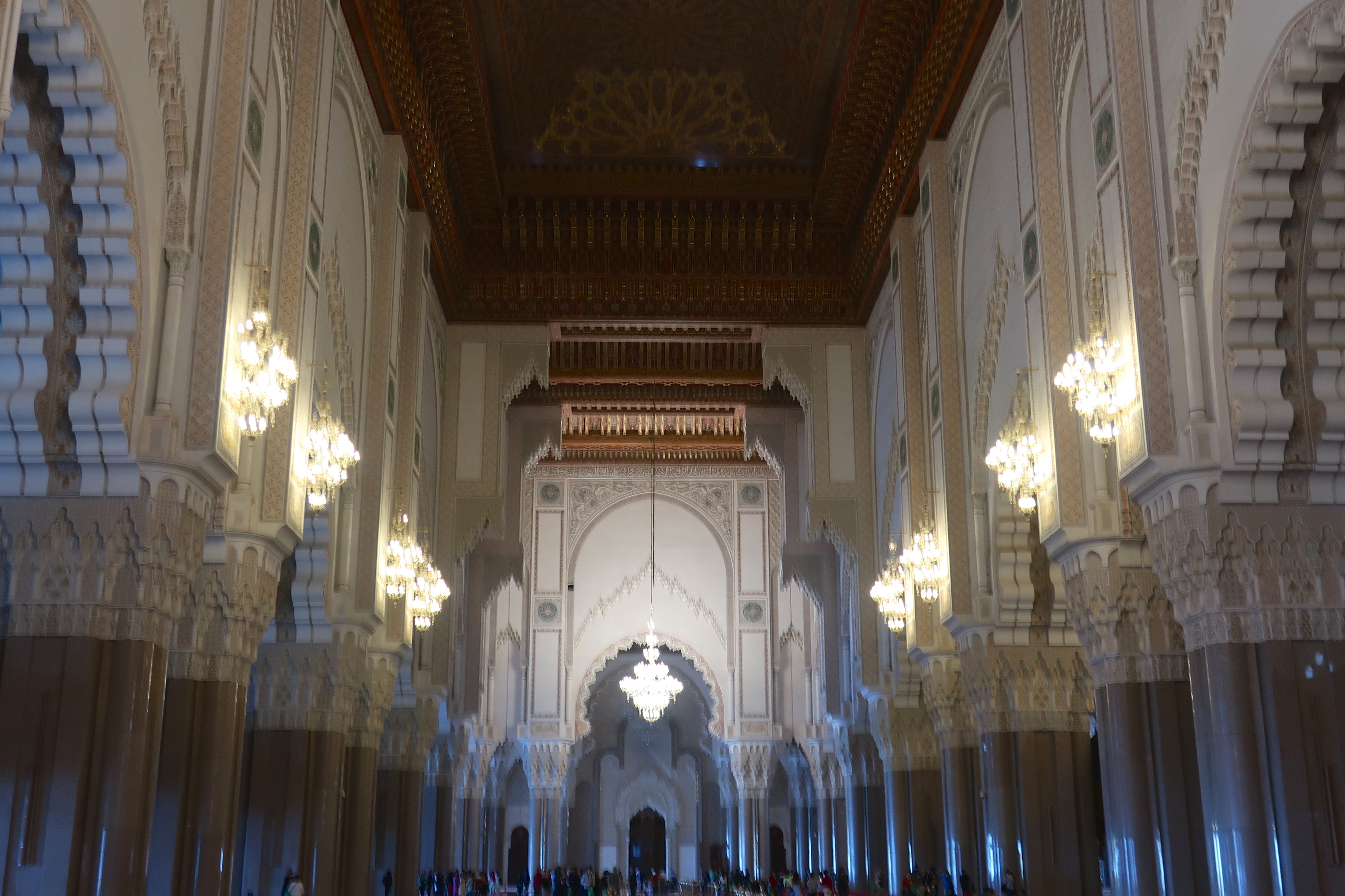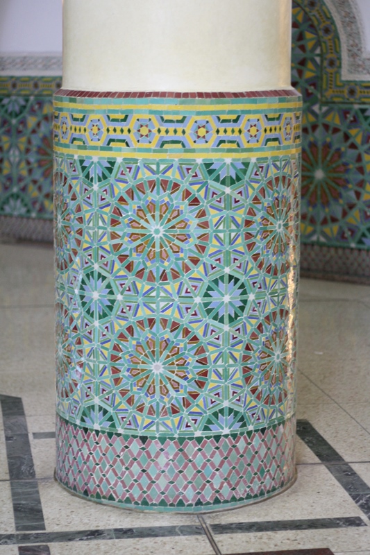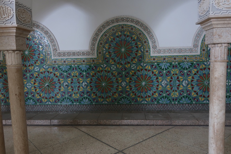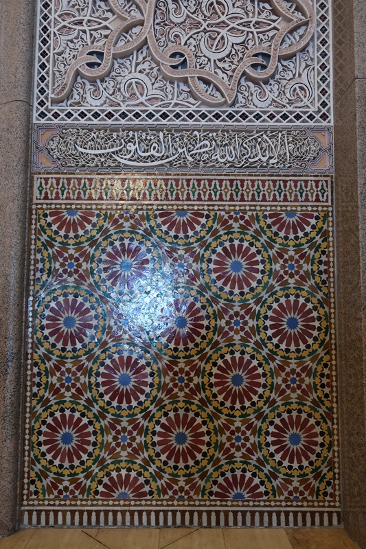 Depois de observado todo aquele espaço exterior de uma grandiosidade absoluta nem se consegue imaginar o que nos reserva o seu interior! É simplesmente sumptuoso: desde as colunas trabalhadas com uma minúcia singular, aos tetos em madeira, ao pavimento revestido com vários tipos de pedra, às paredes forradas/trabalhadas de mosaicos cerâmicos, tudo foi concebido para engrandecer esta mesquita!