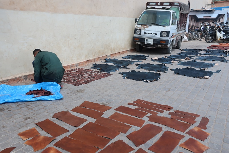 Eles trabalham essencialmente as peles de ovelha, de cabra, de vaca e de camelo. Há todo um processo: desde a retirada de pêlos e carne (às peles), à imersão em cubas enormes numa solução da casca de romã ou mimosa para as transformar em couro, à secagem e enxaguagem para estarem prontas para serem tingidas e a seguir preparadas para serem trabalhadas nas mais diferentes utilizações.