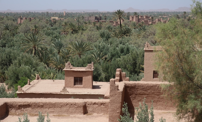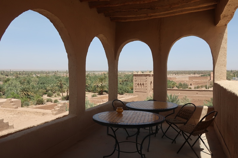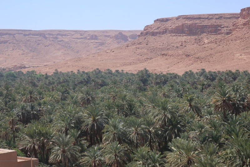Após a visita ao Kasbah Amridil e porque os estômagos ansiavam por iguarias marroquinas e tendo sabido que o Kasbah Ben Moro servia refeições, acabámos por decidir “fazer o sacrifício” de continuar a usufruir de espaços únicos nas nossas vidas. Fizemos a refeição no terraço que tinha como paisagem o palmeiral de Skoura. Foram momentos divinais e de descontração que não se conseguem descrever. Só vividos.