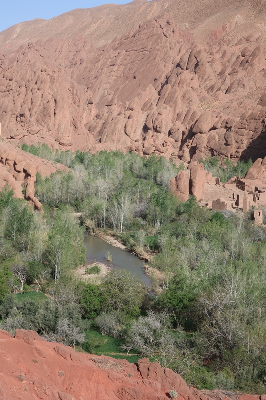 Chegámos ao ponto mais alto da terreola para daí avistarmos um casario que se desenvolvia ao longo do vale do rio Dadès. Esta localidade serve de ponto de partida para quem quer explorar as Gargantas do Dadès e do Todra. Nesse dia fizemos então parte do trajeto para alcançar as Gargantas do Dadès. (próxima vez – partir à mesma de Boumalne para as Gorges pela R704 – 29km – 42 min – depois de Tamellalt ir até Timzzillite – vista panorâmica c/ muitas curvas – alguns hotéis nessa estrada – kasbahs e riads).