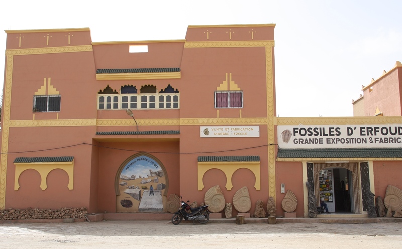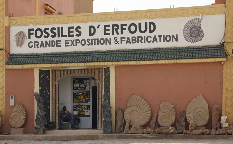Eis-nos perto de Erfoud, (ou Arfoud) sendo conhecida pelos seus fósseis (havendo a possibilidade de visitar uma exploração de mármore e observar o esculpir da pedra de forma a realçar os fósseis a 3 dimensões) que podem ser comprados em espaços como estes à beira da estrada.
