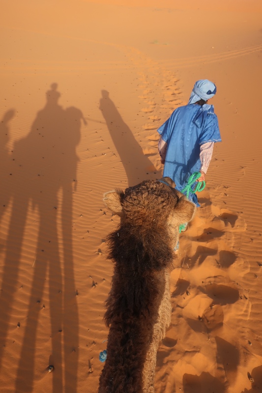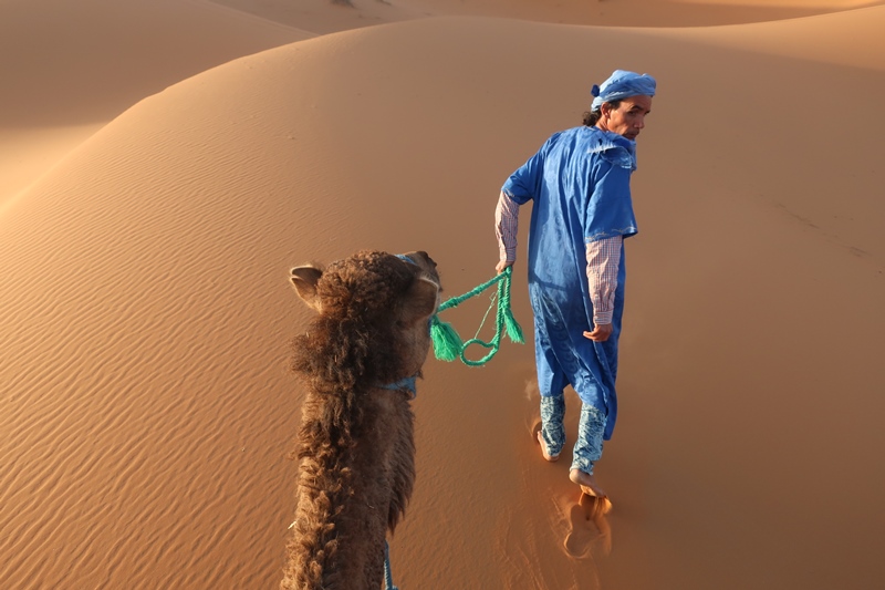 Adorei esses momentos! O nosso guia ia à frente a agarrar a rédea do camelo, só para o ajudar a conduzir no trilho.
