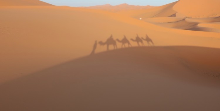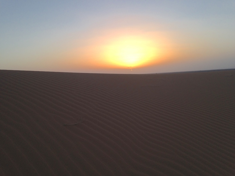 A meia luz confere à areia uma gama ainda mais fascinante de cores! Ainda bem que agora não necessitamos de recorrer a películas, senão a reportagem ficaria caríssima pois é incalculável o número de fotos que se tiram. Ao longo do trajeto pelo deserto íamos encontrando outros grupos que estavam a experienciar o mesmo que nós. A chegada ao ponto mais alto passa por vários momentos diferentes mas fascinantes: a descida do camelo, o contacto dos nossos pés com a areia (é diferente de qualquer praia que se possa imaginar), o momento de observar o pôr do sol num local único. Lá de cima tem-se uma perspetiva abrangente das dunas e de Merzouga bem ao longe.