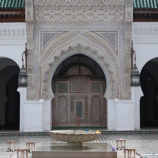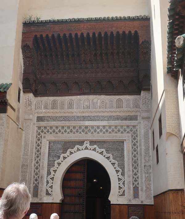 Não muito longe fica a mais antiga e mais ilustre mesquita do mundo islâmico do oeste- a mesquita Karaouiyine – (remonta ao ano de 859 da nossa era). Foi a primeira universidade fundada em Marrocos. Como não está aberta ao público e porque íamos com o guia lá conseguimos tirar algumas fotos. O pátio está pavimentado com 50.000 azulejos. De acordo com o que nos foi dado observar, conseguimos constatar que se trata, de facto, de um espaço muito interessante.