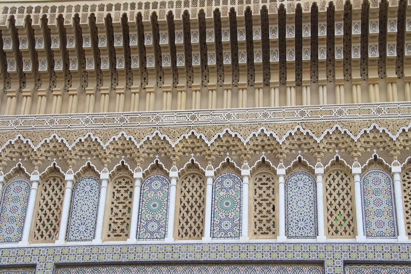 Com alguma pena, lá fizemos o último check out da nossa viagem por terras exóticas, mas ainda nos restavam algumas horas para gozar mais um pouco da cidade de Fez. Hoje, já sozinhos, e com um dia mais promissor a nível do tempo, queríamos rever o Palácio Real e as imediações. O complexo do Palácio Real ( Dar el-Makhzen) situa-se no no centro da zona El- Jedid (Fez nova) Está rodeado por muralhas e cobre uma área de 80 hectares e era a principal residência do sultão. Hoje em dia parte do Palácio ainda é utilizado pelo rei de Marrocos quando ele se desloca a Fez. A entrada principal é monumental. As portas de bronze primorosamente trabalhadas estão equipadas de aldravas de bronze finas.