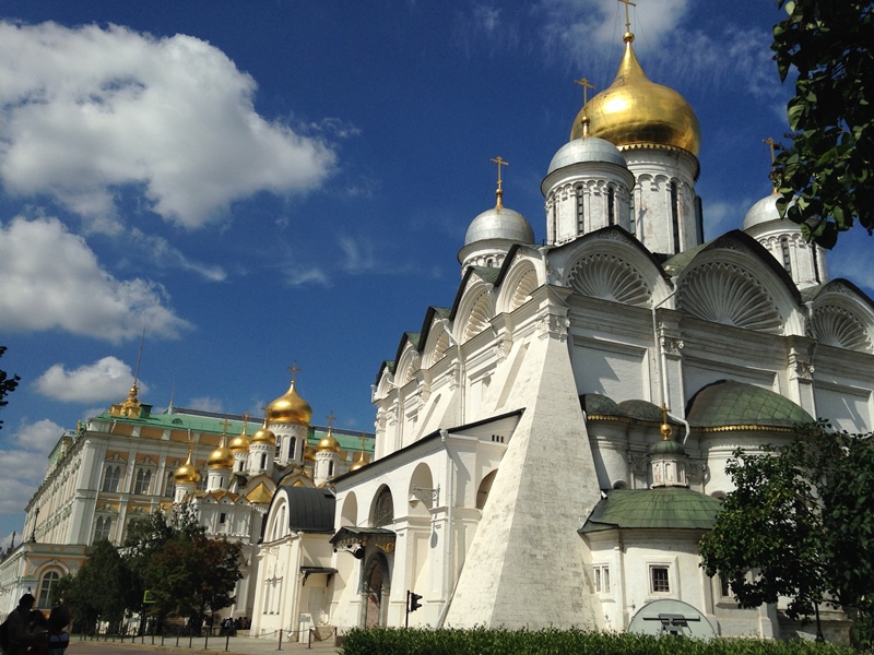 Deixámos a rua principal e dirigimo-nos para a Praça das Catedrais. É uma praça central no Kremlin para onde todas as ruas convergiam no séc. XV. As principais Catedrais são as da Assunção (de 1479), Anunciação (de 1489) e São Miguel Arcanjo (de 1508).