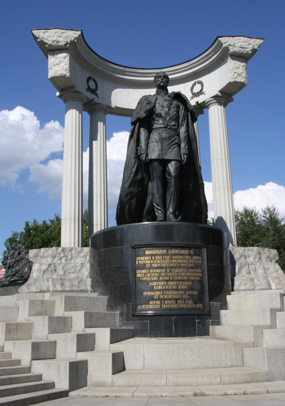 Durante o almoço considerei a hipótese de dar mais uma volta por algumas lojas no intuito de me presentear com recuerdos. Assim foi… mas a nossa intenção não era ficar por ali muito tempo pois ainda tínhamos muito para conhecer nesta tão imensa e grandiosa cidade. Não estando muito longe do Jardim de Alexandre apanhámos o metro na estação Biblioteka Lenina (linha 1 – laranja) e saímos na estação seguinte Kropotkinskaya (no sentido de Yugo-Zapadnaya) com o intuito de ir visitar a Catedral de Cristo Salvador. No percurso para lá passámos pelo monumento em honra de Alexandre II.