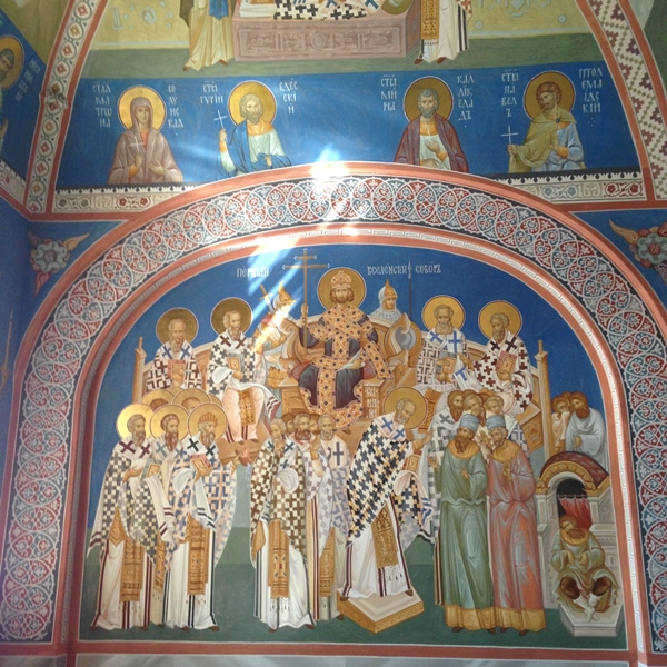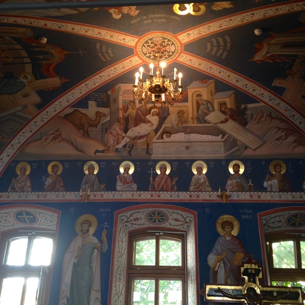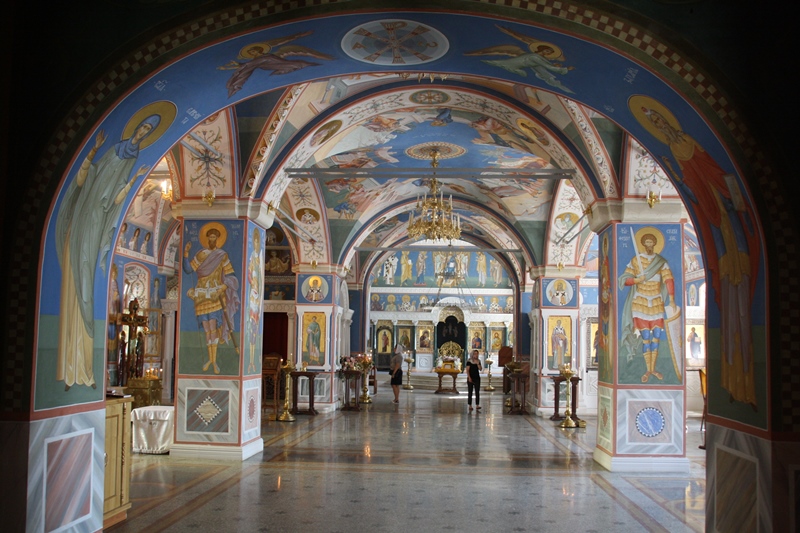 Apresenta uma decoração interna exuberante (não sendo possível fotografar), formada por ícones dourados e bastante coloridos possuindo cinco cúpulas douradas e uma fachada imponente com magníficas esculturas.
