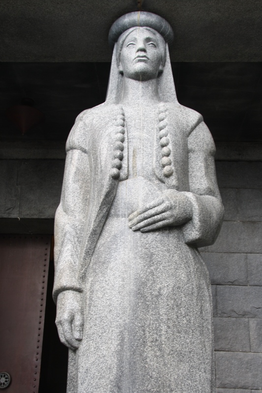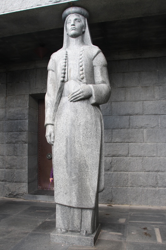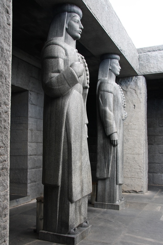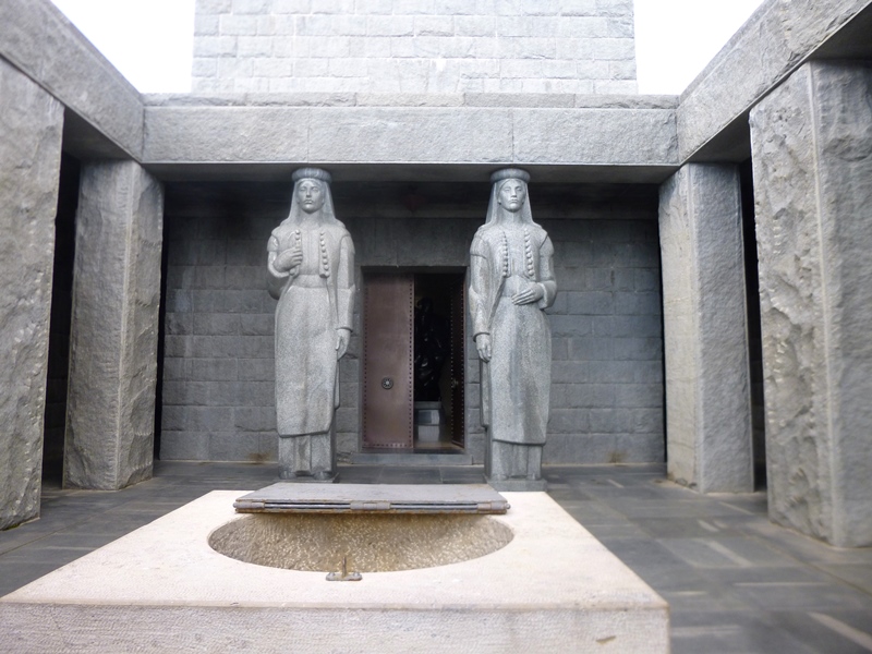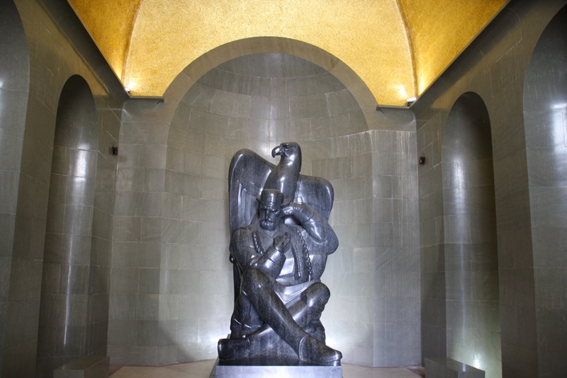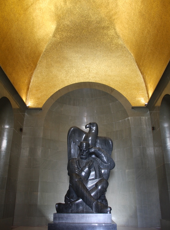 Na extremidade deste, duas cariátides de 4,5 metros de altura em mármore escuro polido emolduram a entrada de uma cripta,