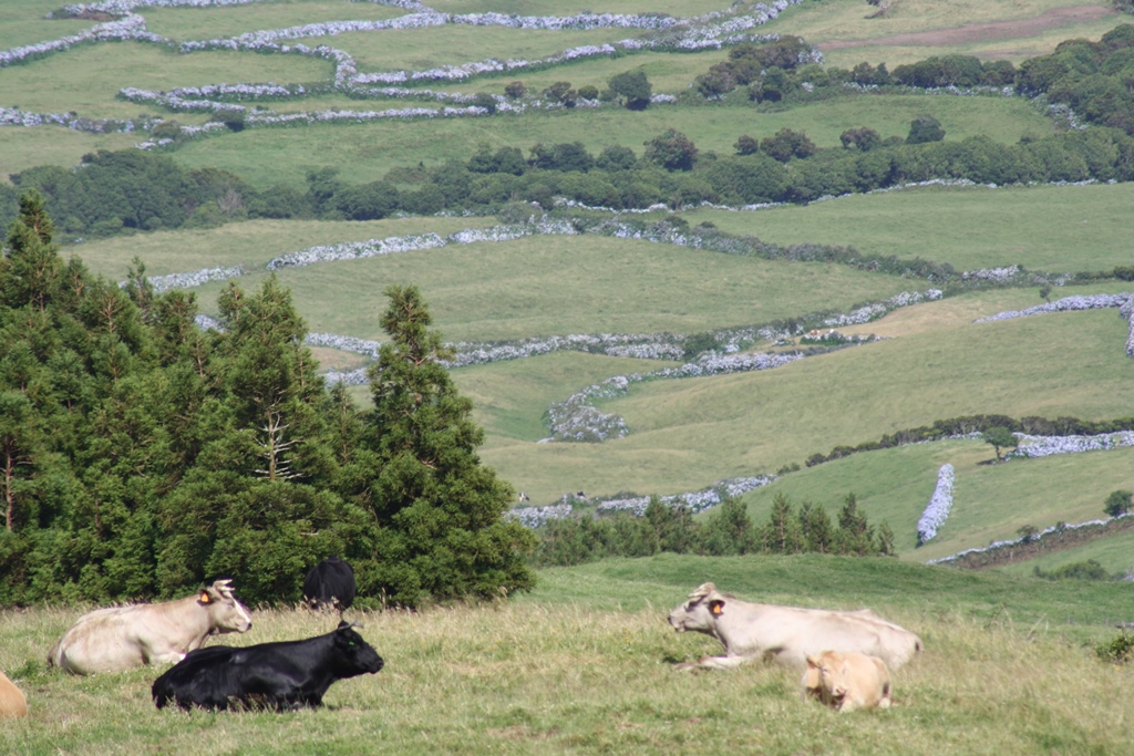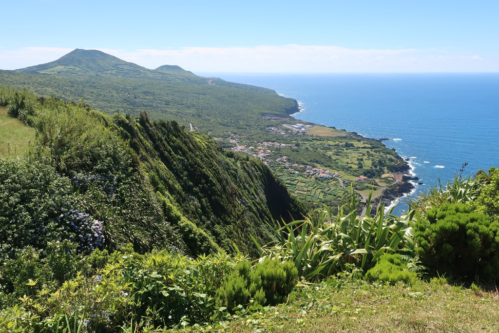 e inúmeros campos de pastagem separados por hortênsias. Usufrui de uma vista soberba para a ilha do Pico, destacando-se a sua imponente montanha.