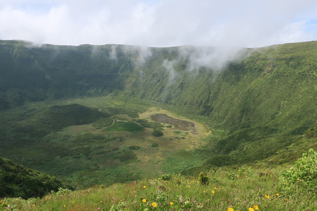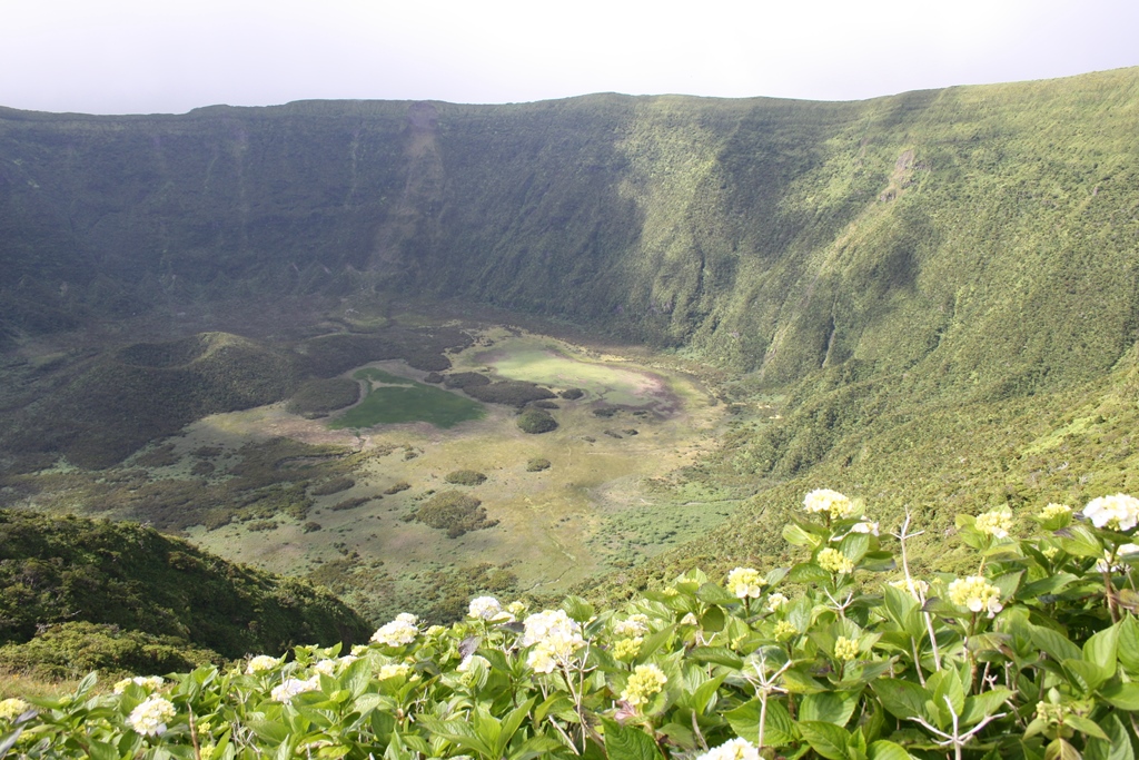 Caldeira – enorme cratera com cerca de 2km de diâmetro e 400 metros de profundidade, rodeada por hortênsias azuis e uma vegetação exuberante.