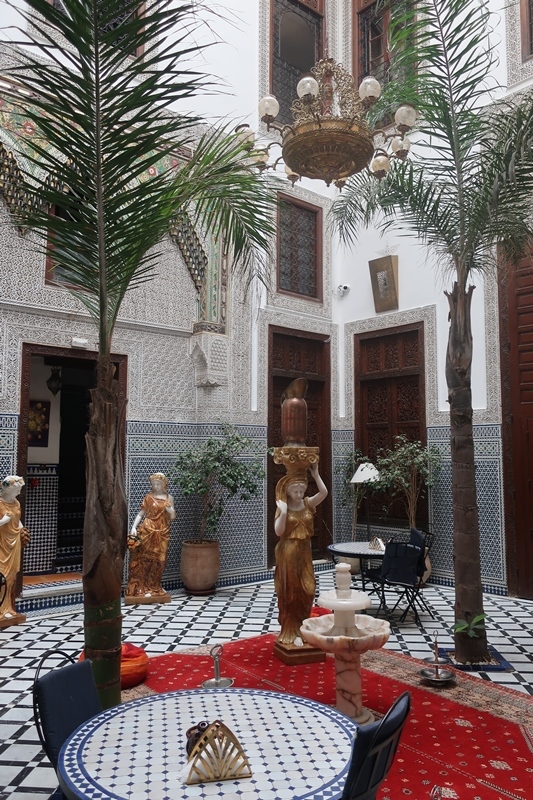 Indicaram-nos onde podíamos estacionar e levaram-nos até à porta do hotel. Eis que por detrás de uma porta discreta somos confrontados com algo nunca visto: Um pátio interior a partir do qual se adivinham os vários espaços.