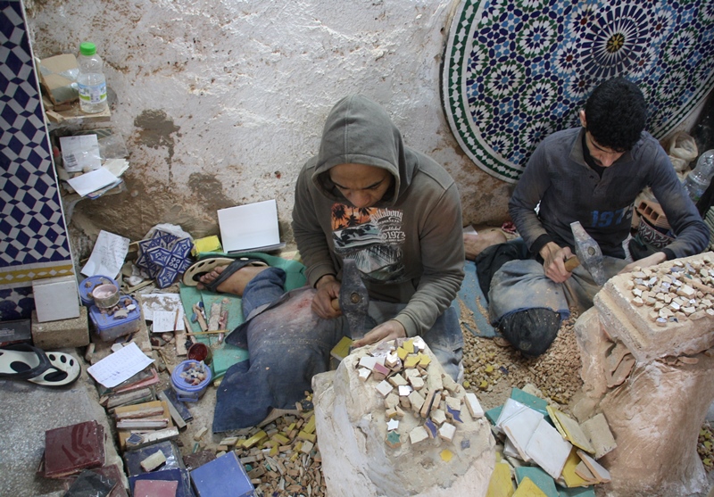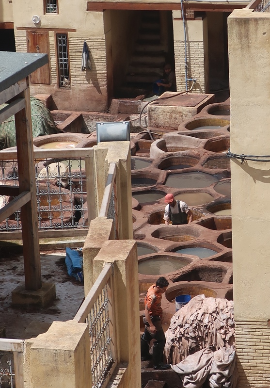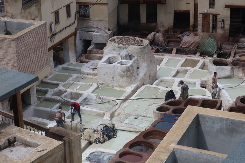 Eles trabalham essencialmente as peles de ovelha, de cabra, de vaca e de camelo. Há todo um processo: desde a retirada de pêlos e carne (às peles), à imersão em cubas enormes numa solução da casca de romã ou mimosa para as transformar em couro, à secagem e enxaguagem para estarem prontas para serem tingidas e a seguir preparadas para serem trabalhadas nas mais diferentes utilizações.