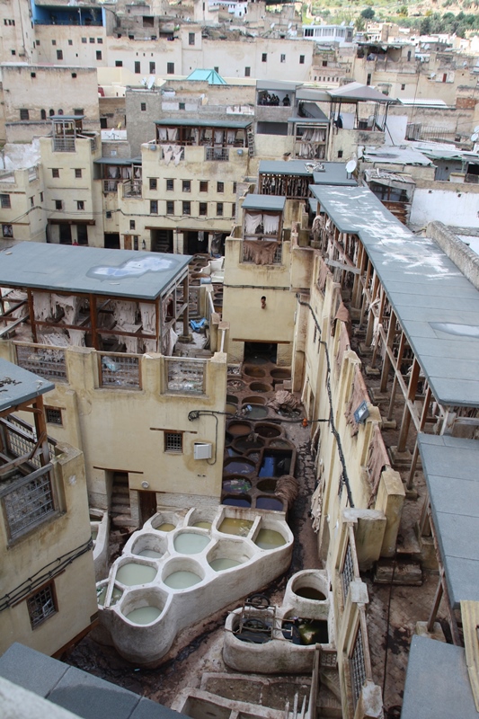 Ainda de carro dirigimo-nos para o souk dos curtidores: É algo ímpar! Começa por se situar perto de um curso de água (porque é necessária no processo de curtir das peles) e não muito perto de bairros residenciais por causa do odor que as peles libertam.