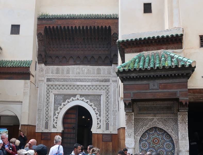 Não muito longe fica a mais antiga e mais ilustre mesquita do mundo islâmico do oeste- a mesquita Karaouiyine – (remonta ao ano de 859 da nossa era). Foi a primeira universidade fundada em Marrocos. Como não está aberta ao público e porque íamos com o guia lá conseguimos tirar algumas fotos. O pátio está pavimentado com 50.000 azulejos. De acordo com o que nos foi dado observar, conseguimos constatar que se trata, de facto, de um espaço muito interessante.