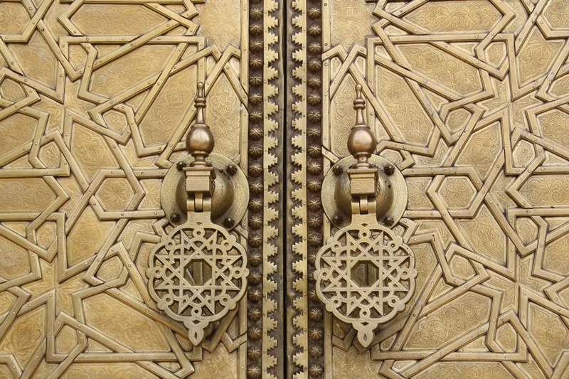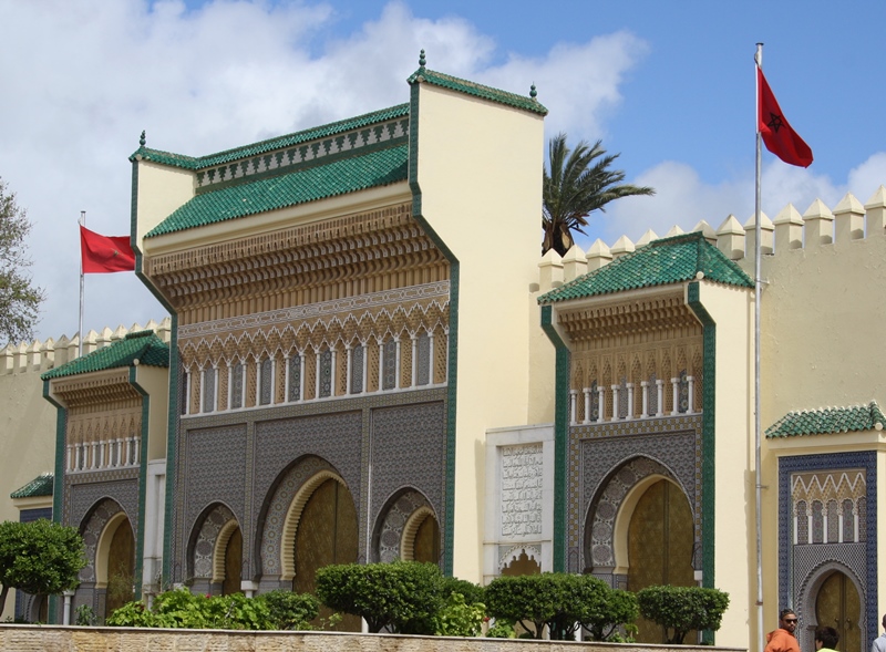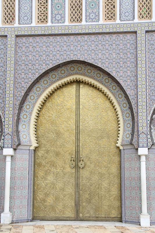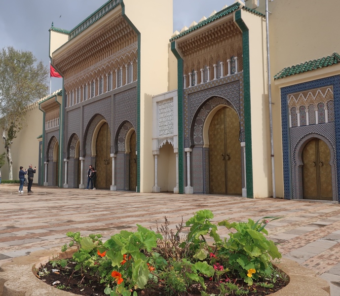 Com alguma pena, lá fizemos o último check out da nossa viagem por terras exóticas, mas ainda nos restavam algumas horas para gozar mais um pouco da cidade de Fez. Hoje, já sozinhos, e com um dia mais promissor a nível do tempo atmosférico, queríamos rever o Palácio Real e as imediações. O complexo do Palácio Real ( Dar el-Makhzen) situa-se no no centro da zona El- Jedid (Fez nova) Está rodeado por muralhas e cobre uma área de 80 hectares e era a principal residência do sultão. Hoje em dia parte do Palácio é ainda utilizado pelo rei de Marrocos quando ele se desloca a Fez. A entrada principal é monumental. As portas de bronze primorosamente trabalhadas estão equipadas de aldravas de bronze finas.