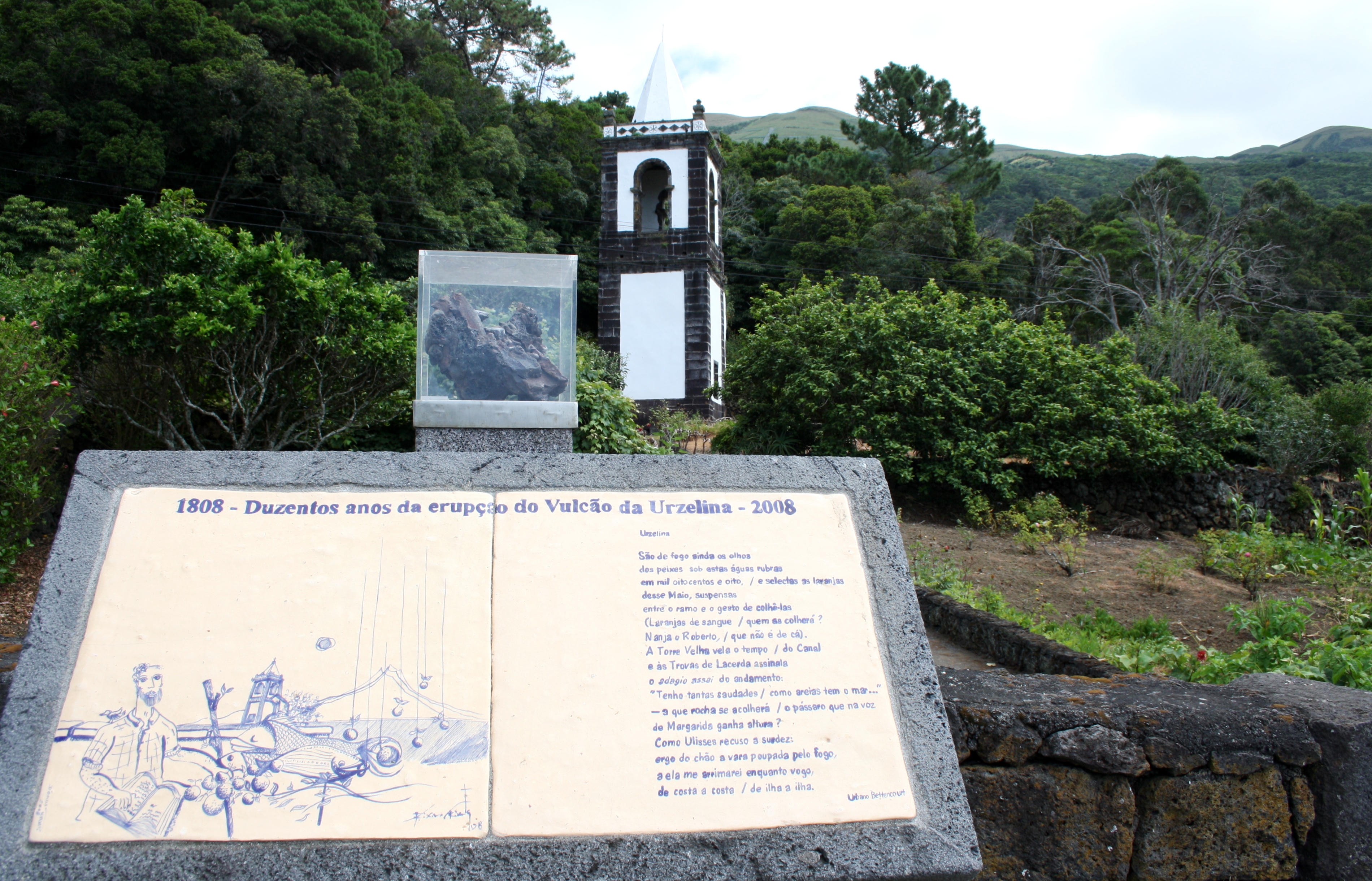 De quando em vez parávamos para nos deliciarmos com a paisagem. O nosso primeiro ponto era Urzelina. Esse local é conhecido pelo facto dessa zona ter sofrido uma erupção vulcânica em 1808. À beira da estrada está um azulejo que conta esse episódio e pode-se ver a Torre Velha ou Torre Sineira que é o que resta da primitiva igreja arrasada pelo manto de lava.