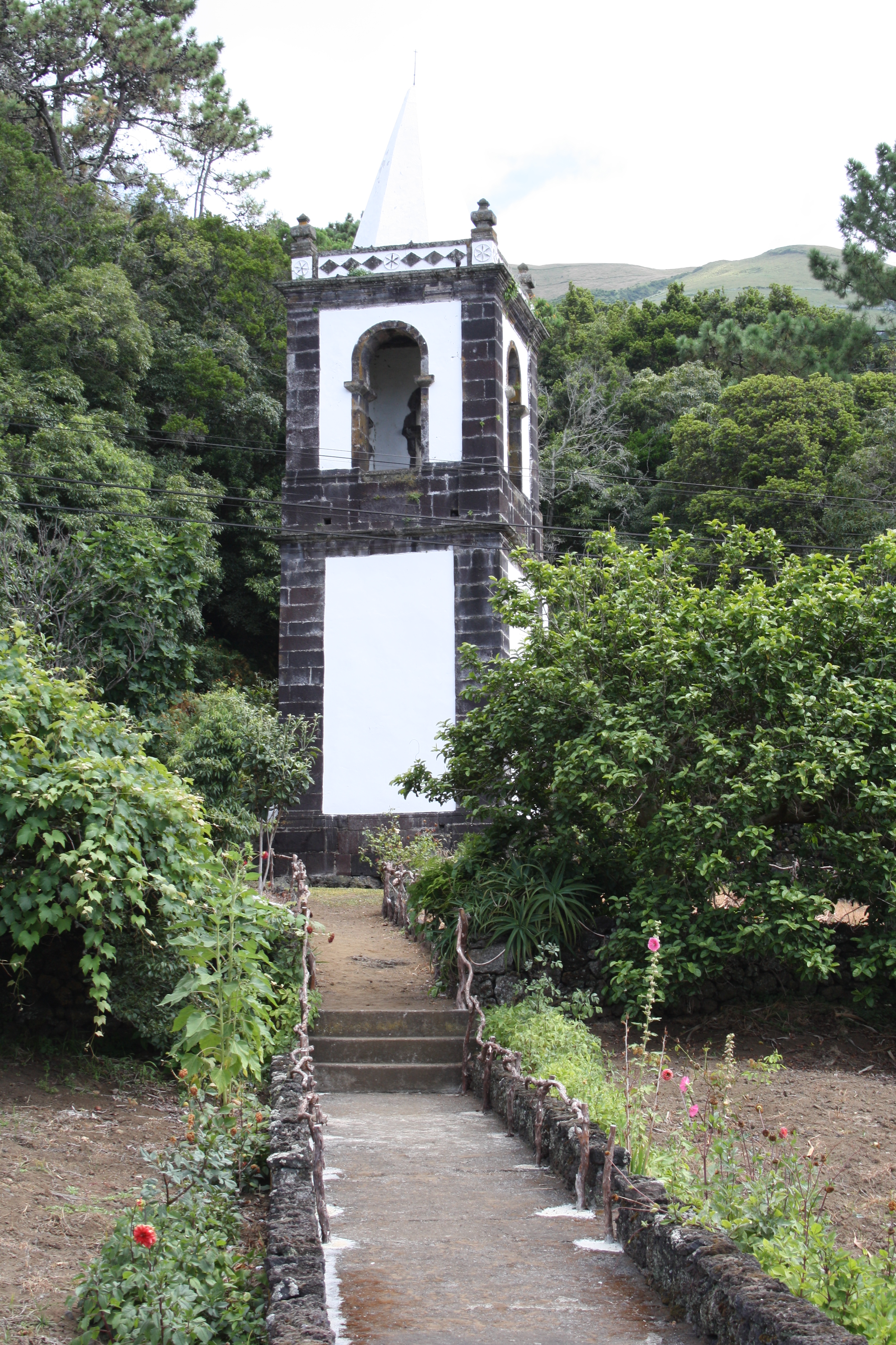 URZELINA – o local mais visitado (à beira da estrada) é a Torre Velha ou Torre Sineira – ela mostra o que resta da primitiva igreja arrasada pela erupção vulcânica de 1808.
