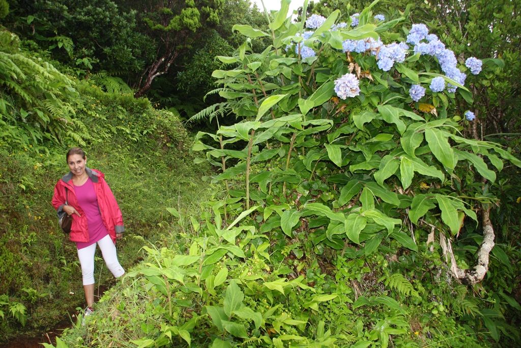 Na zona de Norte Pequeno deixámos a estrada principal e fizemos uma secundária ziguezagueando que lá nos conduziu à Fajã dos Cubres. Aí libertámo-nos do carro e começámos a apreciar a paisagem, incluindo vacas que se alimentavam e ruminavam com toda a tranquilidade. Deve-se levar água, fruta, barritas (pelo menos) porque temos alguns quilómetros pela frente. Caminhámos ao longo da Fajã dos Cubres, para depois iniciarmos o trilho pedestre que nos conduziria à Fajã da Caldeira de Santo Cristo. A meio do trajeto surgiu uma Moto4 e nós tivemos que nos desviar para cedermos passagem pois o trilho era tão estreito que não permitia “transeuntes e motoqueiros”! Qual não foi o nosso espanto quando o senhor nos perguntou se queríamos boleia. Eu e o meu marido olhámos um para o outro e acabámos por aceitar embarcar nessa aventura! Nessa altura já tínhamos calcorreado uns quantos quilómetros e outros tantos faltariam! Quando finalmente chegámos à fajã pensámos que se não tínhamos morrido desta, já não morreríamos! Houve troços em que cabia apenas e unicamente a moto4, com a água à esquerda e a falésia rochosa à direita.