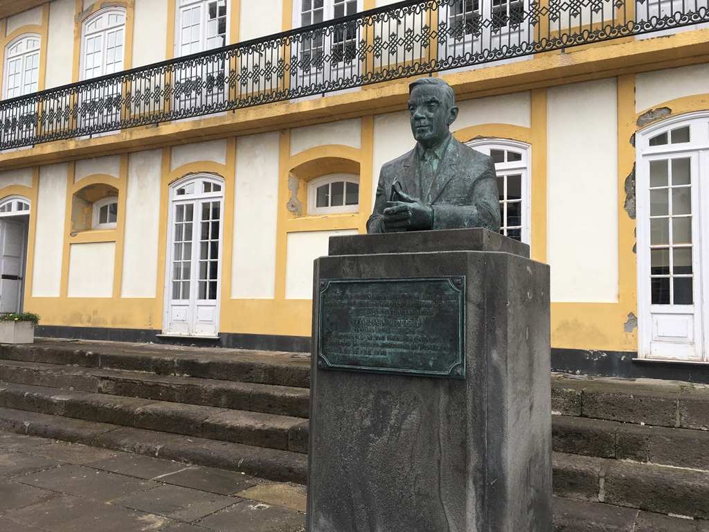 Estacionada a viatura perto dos pontos de interesse, começámos num dos topos da Rua da Misericórdia onde nos deparamos com a Casa das Tias de Vitorino Nemésio (que neste momento funciona como Biblioteca Municipal), a Estátua de Vitorino Nemésio