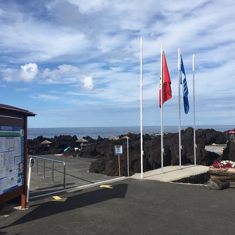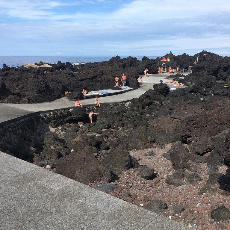 De seguida dirigimo-nos (pela estrada do interior) para a costa norte para a zona balnear dos Biscoitos, muito apreciada pelos locais e por quem visita a ilha. Aí gozámos a tranquilidade e atmosfera que se vivia por ali. Uns refrescavam-se nas águas das piscinas naturais e outros ingeriam algo fresco, num local descontraído e com uma paisagem apetecível! Nós optámos pela 2ª hipótese.