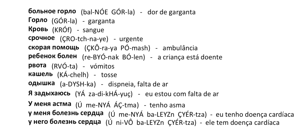 Seguem-se alguns termos e expressões relacionados com problemas de saúde (здоровье – zda-RÓ-vya) que possam surgir durante a viagem.