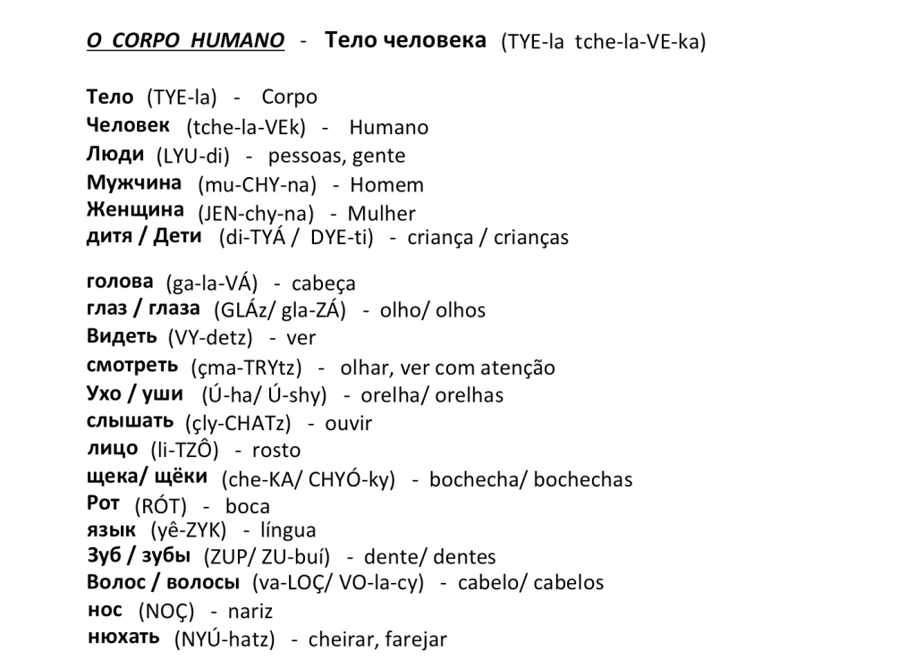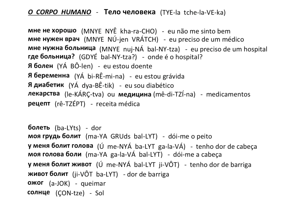 Os viajantes são seres humanos (люди – LIÚ-di) e nalgumas circunstâncias podem pretender mencionar alguma região anatómica em russo ou ter algum problema de saúde inesperado, motivo pelo qual incluímos o capítulo “Corpo Humano e Saúde” no nosso glossário russo. Apresentamos alguns termos e expressões (que consideramos mais simples de pronunciar) relacionados com a anatomia do corpo humano e com situações de doença que possam ocorrer durante a viagem.