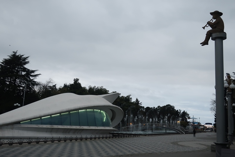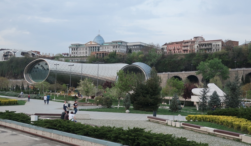 e do outro lado do rio um impressionante edifício que se destaca não em altura mas pela peculiaridade da sua forma e estilo vanguardista – a Sala de Espétaculos de Tbilisi. No cimo há um outro que prende também a nossa atenção – o Palácio Presidencial, também em estilo moderno.