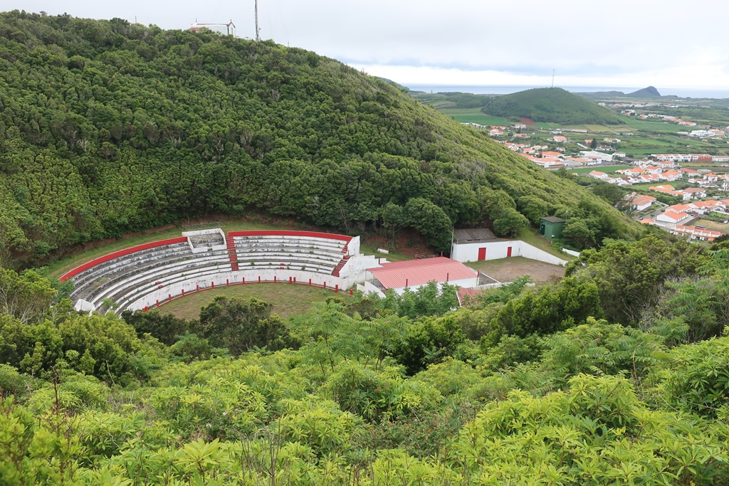 Daí seguimos de carro até ao topo do Monte de Nª Sra da Ajuda, (onde existem 3 ermidas) sobranceiro à vila de Santa Cruz. Num plano inferior, na cratera do vulcão do monte, existe uma pequena Praça de Touros que é utilizada durante a feira taurina (meados de agosto).