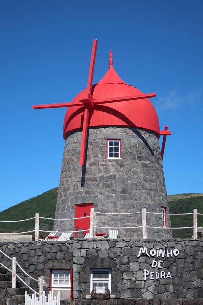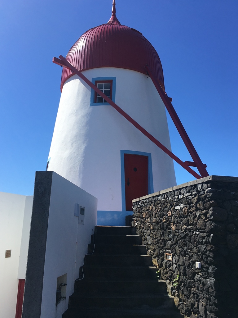 Aí contactámos pela 1ª vez, com um dos ícones da Graciosa – moinhos – o Moinho de Pedra e o Moinho Boina de Vento, ambos utilizados como alojamento. São, de facto, algo memorável! Pena estar a chover! Abortámos e regressámos ao hotel, onde já tínhamos reservado mesa para jantar.