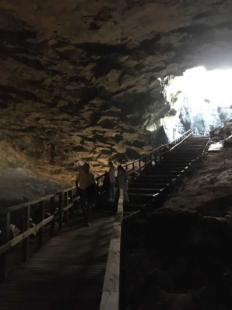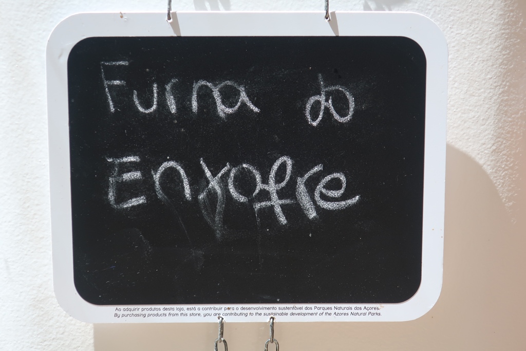 Bom … mas o nosso dia ainda mal tinha começado! Começámos a descer, tendo passado pela localidade do Carapacho, sendo que as Termas estavam fechadas devido à pandemia. Fizemos a estrada até à povoação da Luz, seguindo depois para Canada Longa com a finalidade de cumprir um momento alto do nosso plano: a visita à Furna de Enxofre (tínhamos telefonado de antemão para reservar mas foi-nos dito que não era necessário). No início do percurso (no exterior) somos agraciados por uma paisagem descontraída,