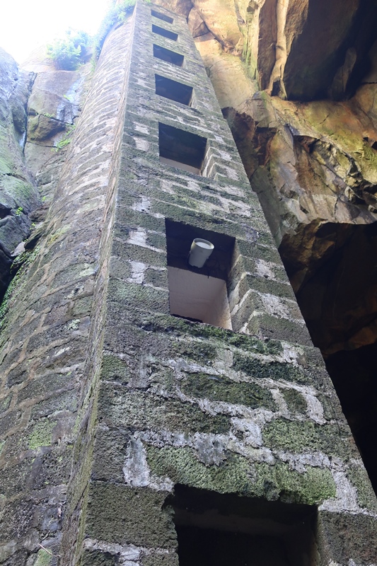 contrastante a partir do túnel pois para aceder à gruta, tem que se descer uma escada em espiral de 183 degraus até ao chão da caverna, onde se estende uma lagoa de água fria. Depois de, na preparação da viagem os olhos terem observado a imagem da chaminé vista de fora, e agora poder contemplá-la ao longo da sua descida (escadaria), oferecendo ela, através das suas janelas uma visão para um plano superior ou inferior, é colossal! Nada como passar do virtual ao real! É de facto um momento digno de nota, na ilha Graciosa.