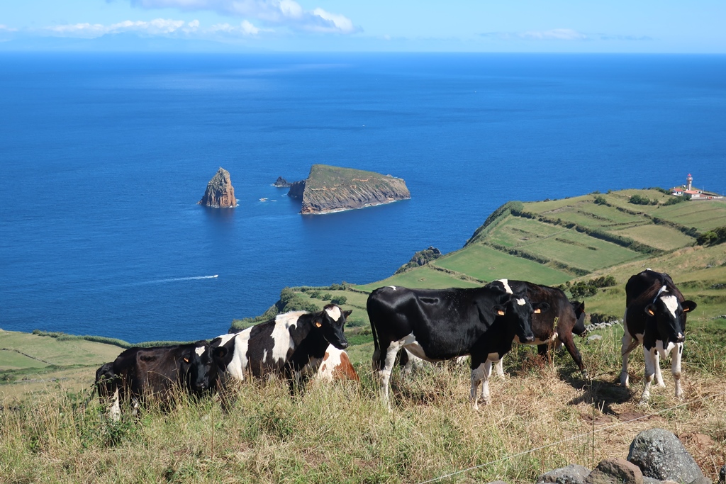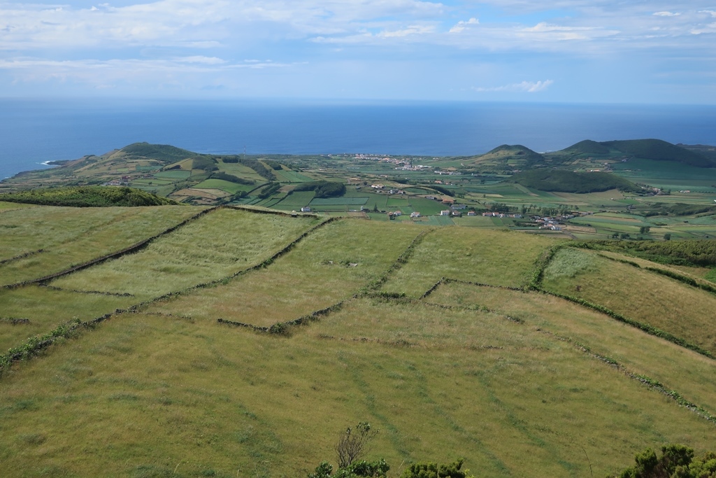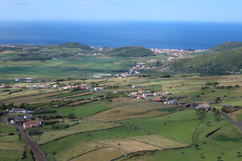 Após esses momentos fabulosos, mais tínhamos para gozar pois tendo continuado a fazer o trajeto em redor da Caldeira de uma zona mais alta e mais abrangente, fomos contemplados com perspetivas ainda mais ricas da costa que já tínhamos feito – Praia e Ilhéu de S. Mateus, a zona do Miradouro da Restinga, o Ilhéu de Baixo, o Farol do Carapacho e a ilha Terceira – pequenos prados com vacas e com hortênsias os quais ajudavam a completar o cenário! Simplesmente de cortar a respiração!