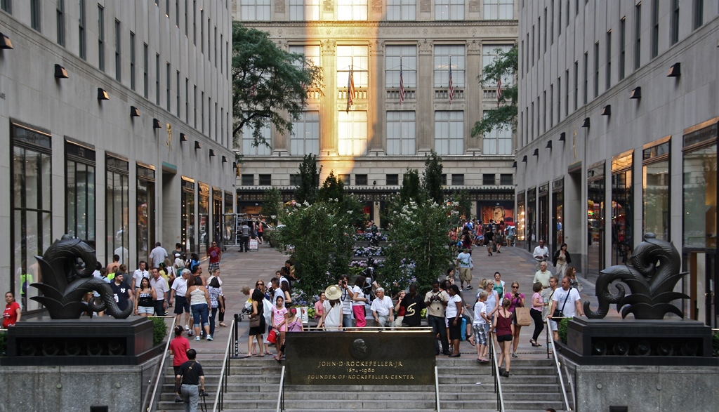 Rockefeller Center – É o maior complexo do mundo de um particular (19 edifícios). O seu início remonta à década de 1930 sendo o primeiro projeto comercial a integrar jardins, área comercial incluindo restauração e escritórios. Assim sendo alberga: 2 jardins – Channel Gardens e Sunjen Garden; o G.E. Building – sendo este o edifício mais relevante do complexo – com uma Área Comercial subterrânea e o The Top of the Rock; os Estúdios da NBC; os Estúdios do Today Show; o Radio City Music Hall sendo de salientar ainda a Estátua de Prometeu e a Estátua de Atlas. O Rockefeller Center estende-se das 5th às 8th Avenues, entre as 48th e 51st Streets.