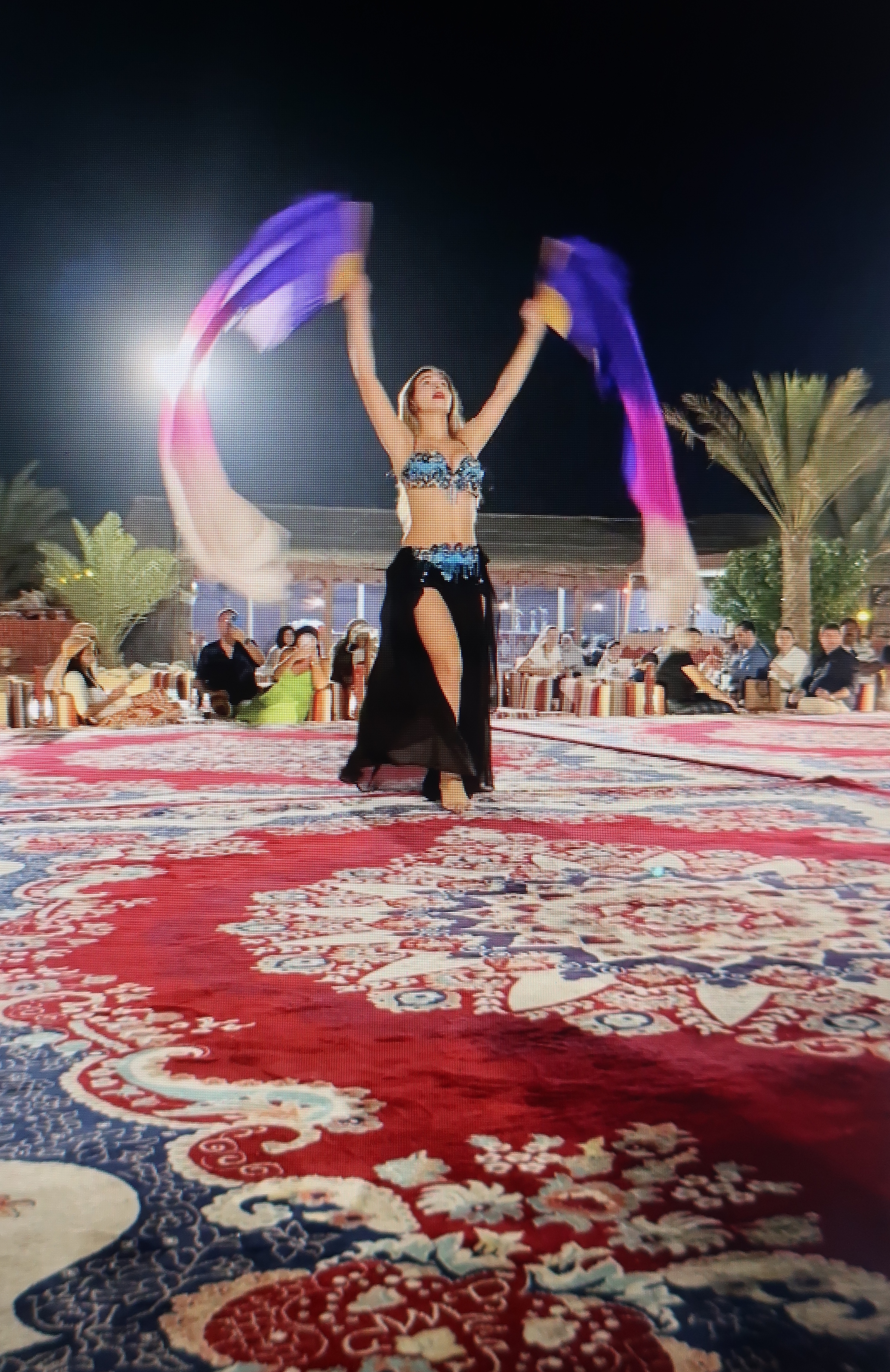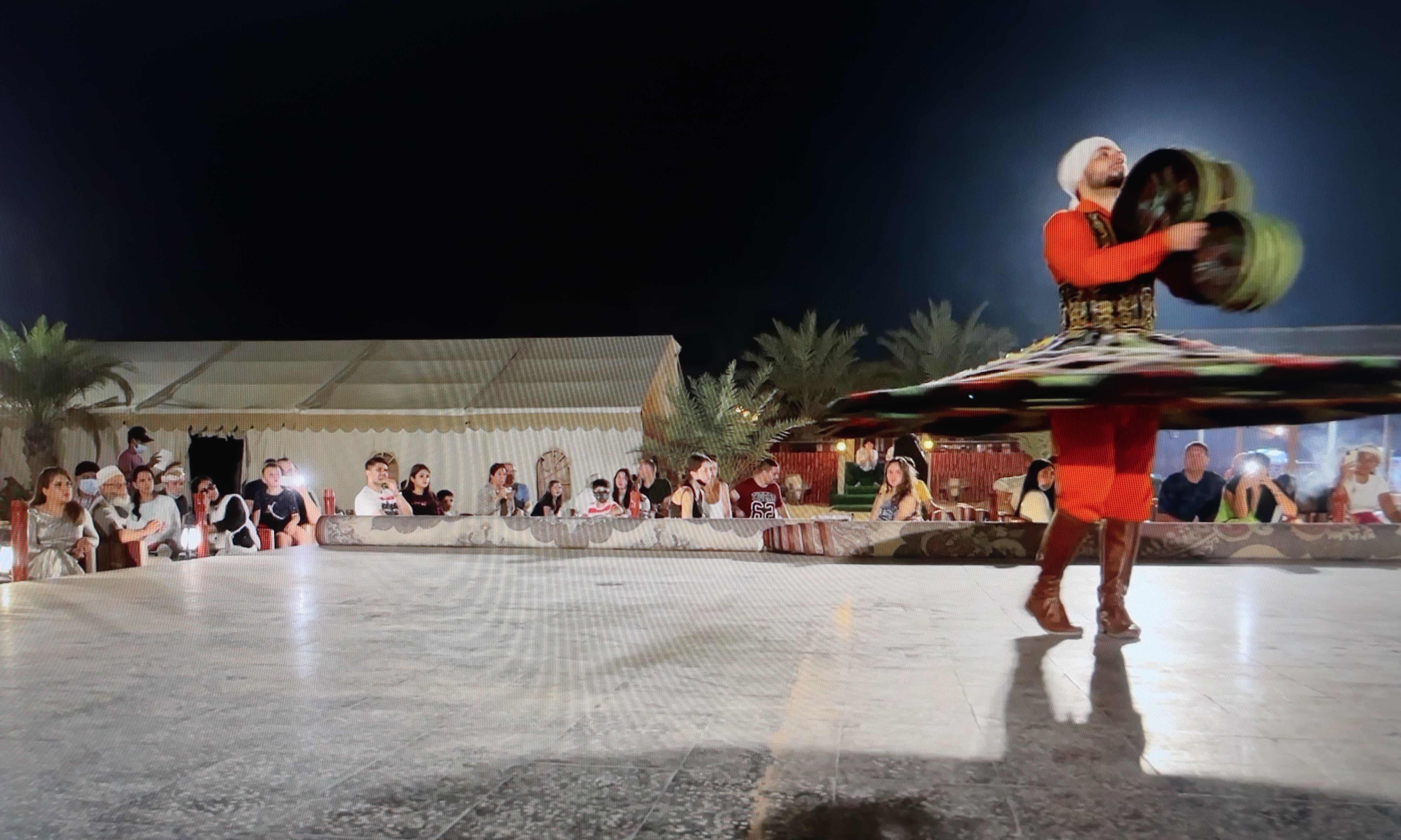Mas o dia não findava aqui! Incluía um jantar e um espetáculo no coração do deserto (no Emirado de Sharjah)! Fizemos um trajeto de jeep de mais alguns minutos até chegarmos ao acampamento onde poderíamos então contactar com camelos – um breve passeio de camelo para quem quisesse passar pela experiência de subir para cima de um deles, depois dirigimo-nos para a zona das mesas e tapetes para o momento da refeição e espetáculo. O jantar consistia num buffet de churrasco acompanhado por um espetáculo de luzes, cor e som! Assistimos desde a dança do ventre, a malabarismos com o fogo e com peças que ascendiam nos ares sem cair! É algo único!