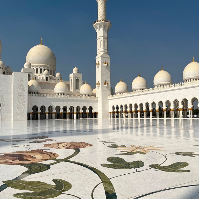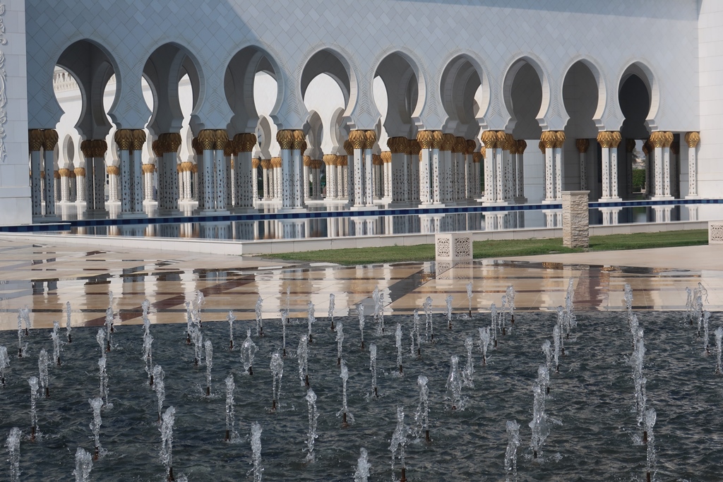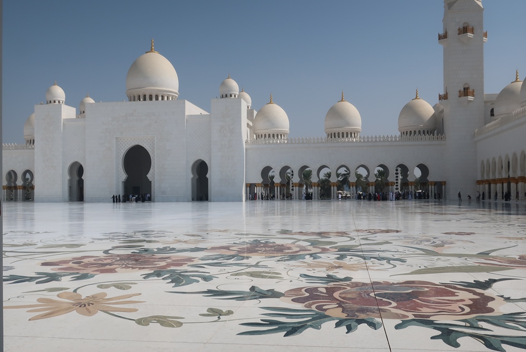 A Mesquita Sheik Zayed oferece, então, um espaço ajardinado, um pátio bastante amplo, considerado o maior exemplo de mosaico de mármore no mundo (17.4000 m²) com desenhos florais espantosos,