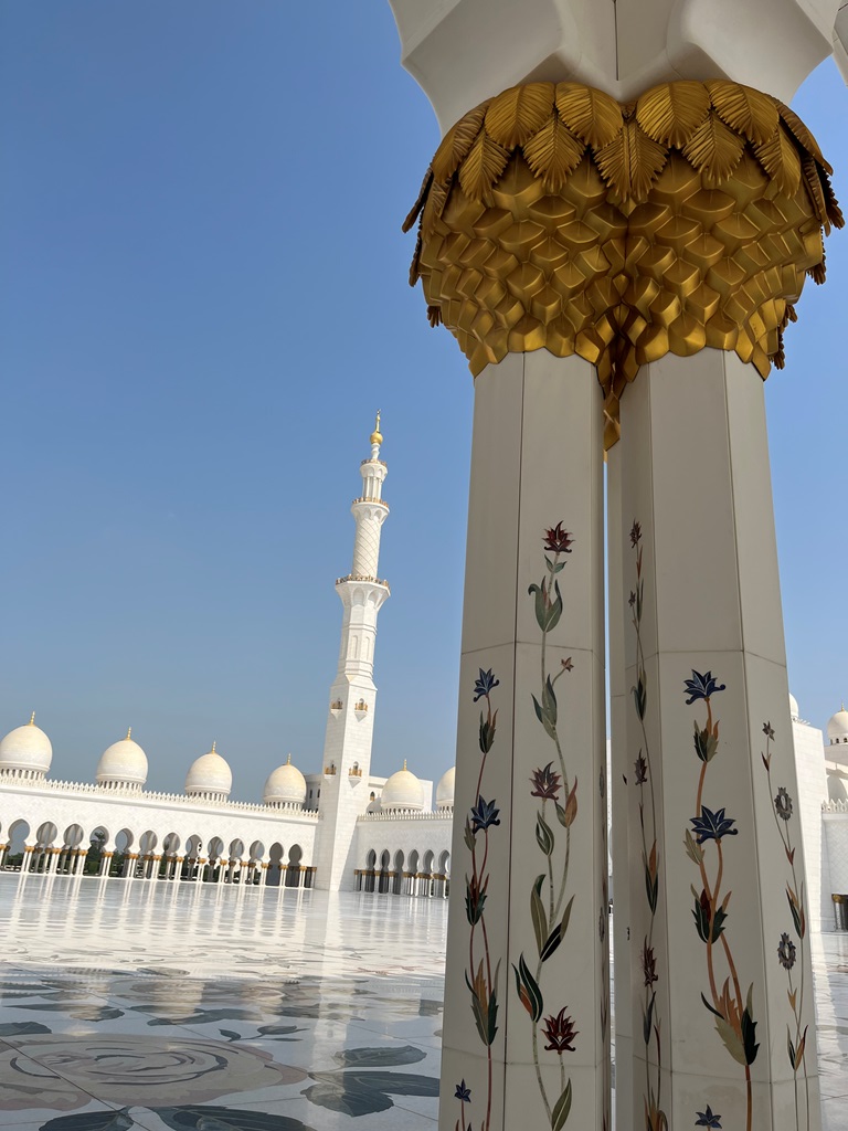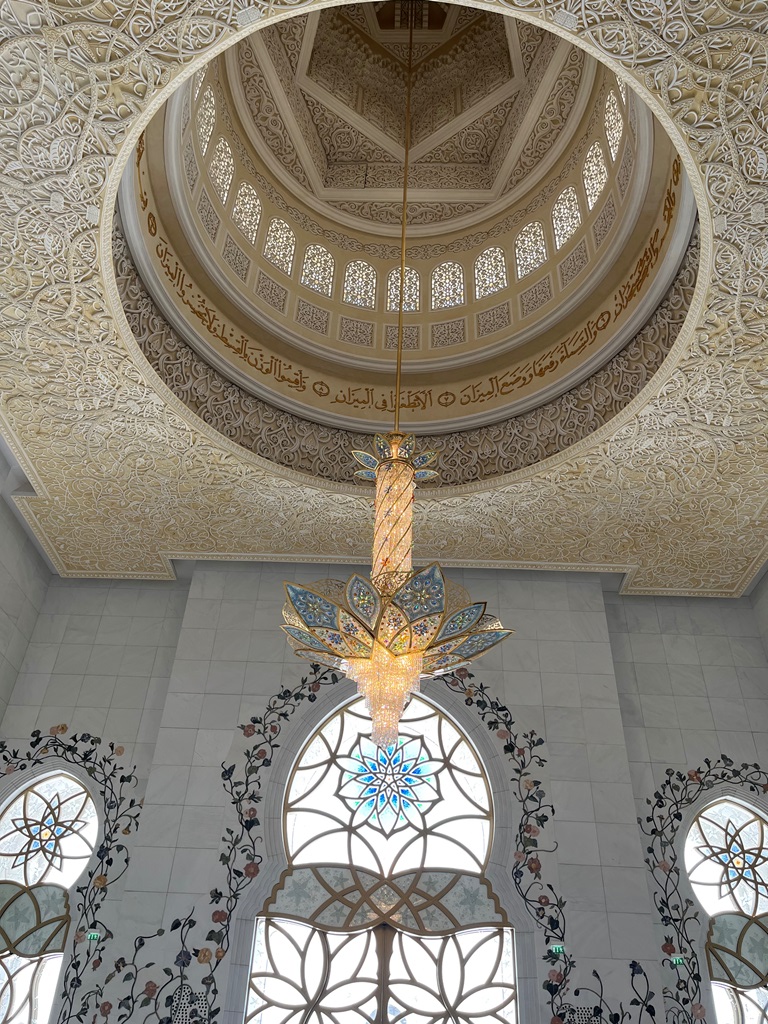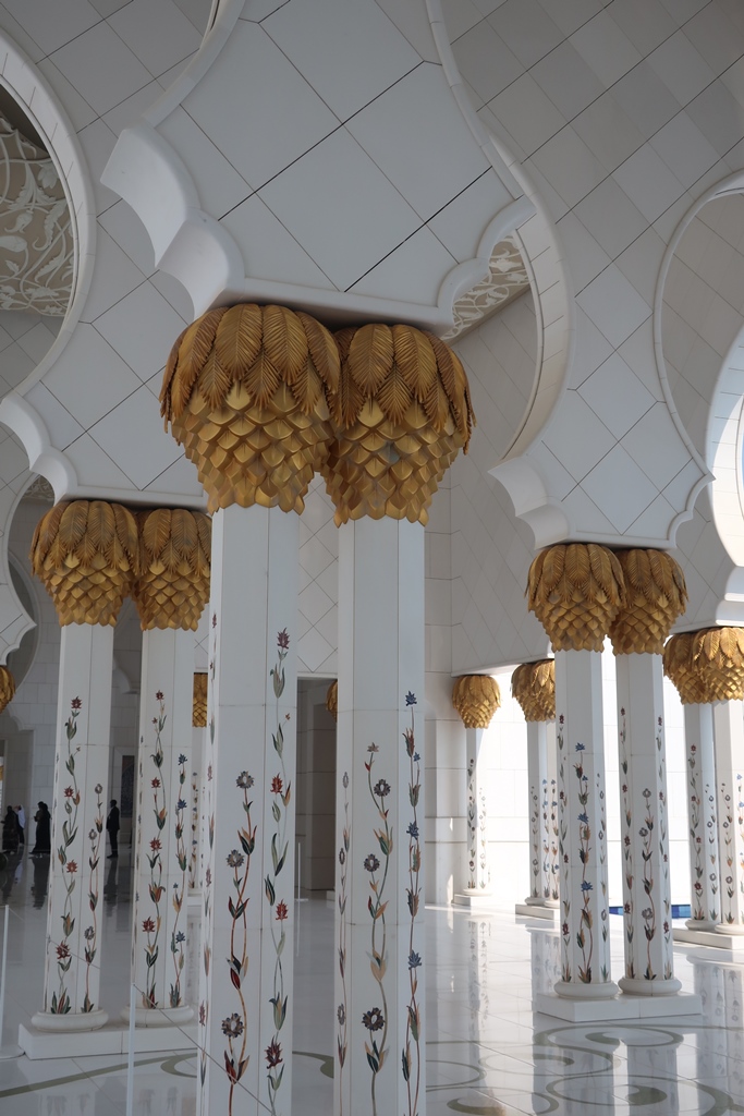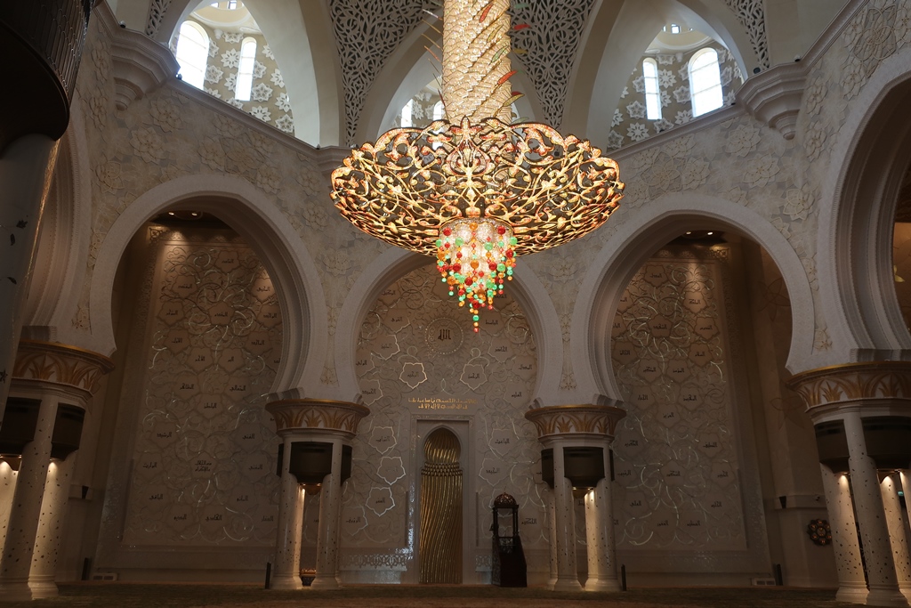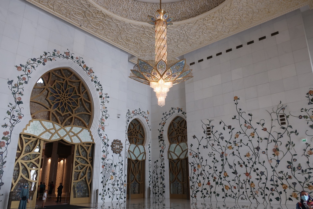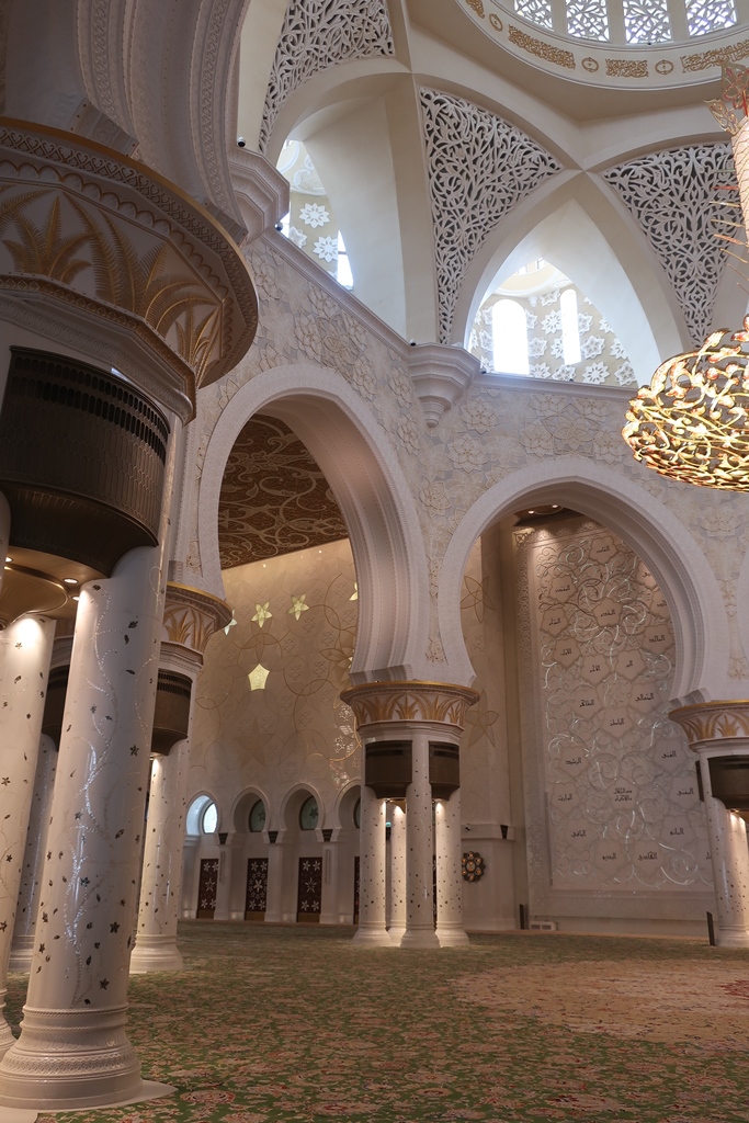 Continuando… com um exterior de mármore reluzente, fontes com as suas águas cristalinas dançantes, o pormenor dos motivos florais do piso, a imensidão de colunas ricamente decoradas, temos dificuldade em prosseguir a visita, mas a curiosidade aguça o apetite! E pronto! Aí temos mais um pouco da riqueza e sumptuosidade do interior da magnífica Mesquita Sheik Zayed com a sensação dos detalhes terem sido feitos para nos impressionar: do chão ao teto, encontram-se desenhos, inscrições árabes, colunas, lustres e arcos em forma de ferradura.