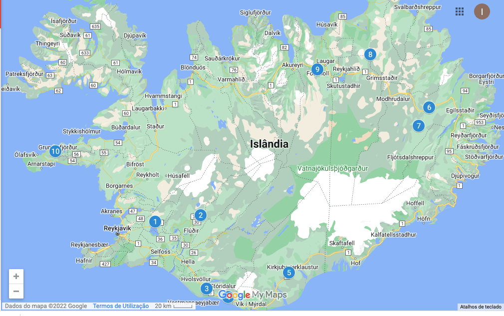 O mapa abaixo indica a sequência de cascatas e desfiladeiros do nosso roteiro circular pela Islândia durante 8 dias, no sentido anti-horário, não tendo incluído a zona dos Fiordes do Oeste.