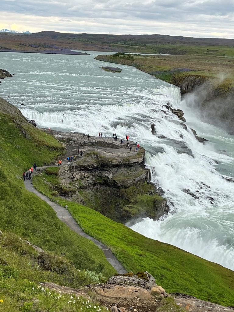 A fascinante e volumosa Gullfoss ou Golden Falls, com 32 metros de altura, alimentada pelo rio glacial Hvítá, cai numa queda de duas camadas num desfiladeiro acidentado. Os sons da água e as cores são intensos. Espetáculo natural de tirar o fôlego com cascata “tripla” pois pode ser observada de três pontos, permitindo cada um deles uma visão diferente: trilho inferior mais perto da cascata (aconselhável levar parka para não se molhar), zonas intermédia e superior: alcançadas através de uma enorme escada. Deve-se levar sapatos/ténis resistentes, apesar de ser fácil circular mas o piso pode estar escorregadio.