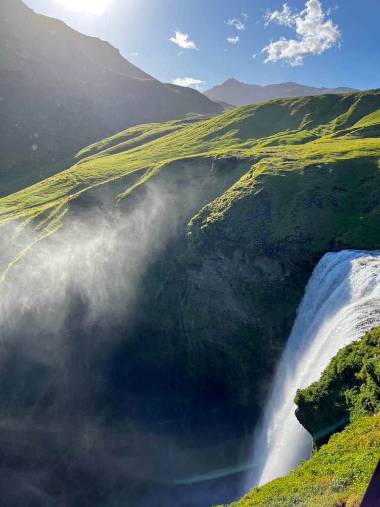 Skógafoss é uma das maiores quedas de água da Islândia, ficando situada na parte sul da ilha, a cerca de 5 km da localidade de Skógar. Desenrola-se na parte final do rio (com o mesmo nome – Skóga). Tem 60 metros de altura e mais de 25 metros de largura. É considerada uma das mais famosas e mais bonitas. Pode ser contemplada de baixo ou de cima (se tiver coragem de subir 430 degraus). Vale a pena subir pois vê-se parte do seu percurso e assiste-se ao cair da água de uma forma impetuosa e incessante sobre um leito de pedras negras. Usufrui-se também de uma vista espetacular da costa sul da Islândia.