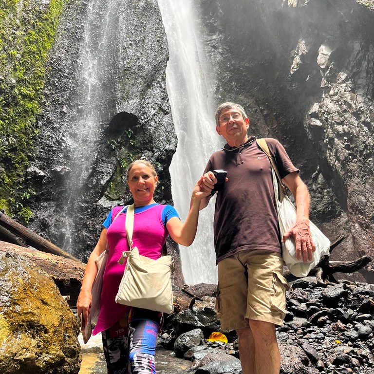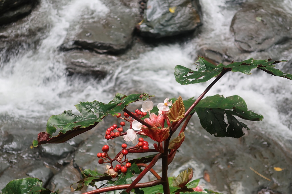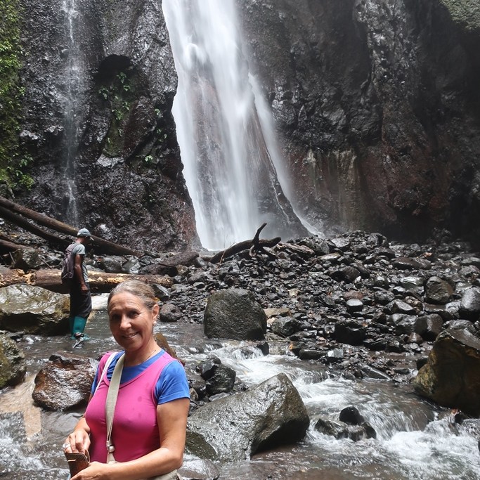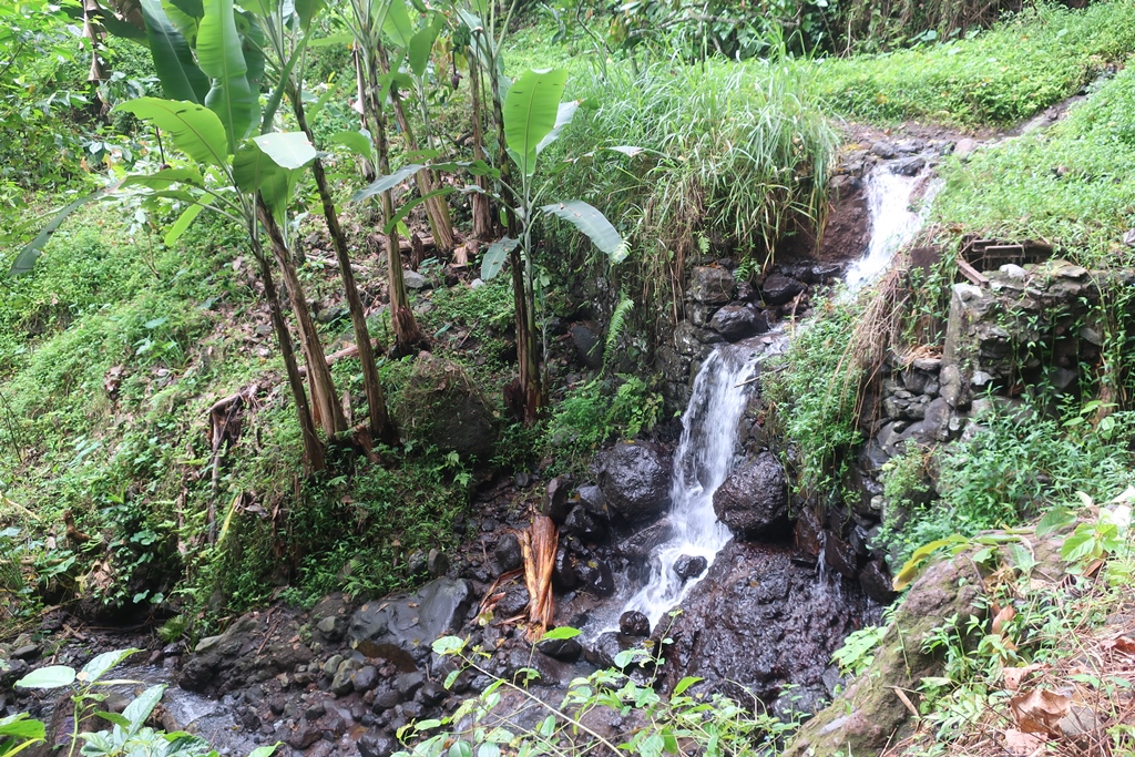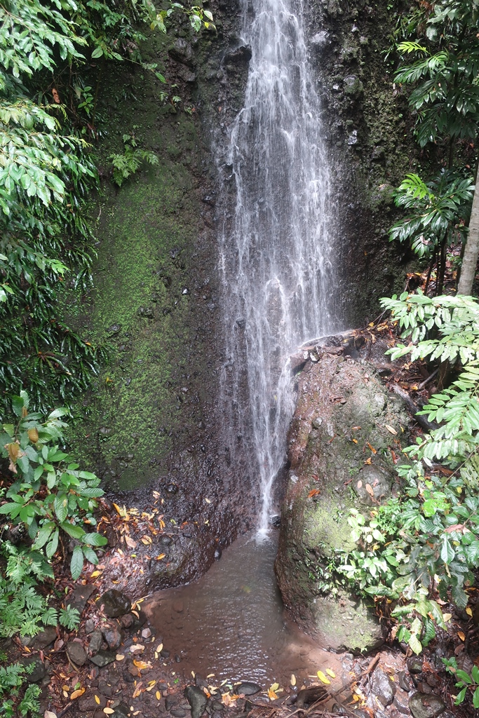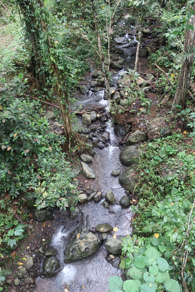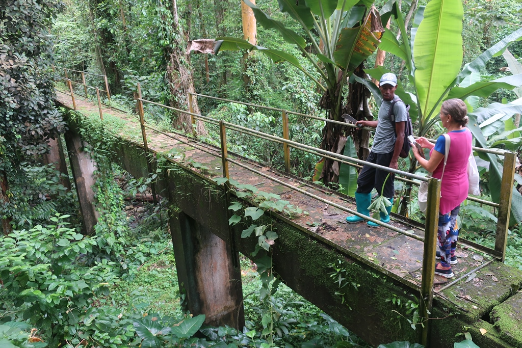 Na manhã seguinte começámos a aventura por volta das 8h e 30 minutos. O guia foi connosco no nosso jipe. Passámos na Roça Ponta Figo, tendo depois feito um trajeto numa estrada irregular e não esfaltada em sentido ascendente. Aí libertámo-nos do jipe e começámos desde logo a contactar com imensos cacaueiros, com ribeiras, cascatas e uma quantidade de arbustos, árvores infindáveis com nomes desconhecidos e o alegre chilrear de aves nativas entre elas o obô que segundo reza a história quando ele canta insistentemente, é sinal de chuva! É algo que nos enche, desde logo, a alma e “esvazia os rolos de fotografia”!