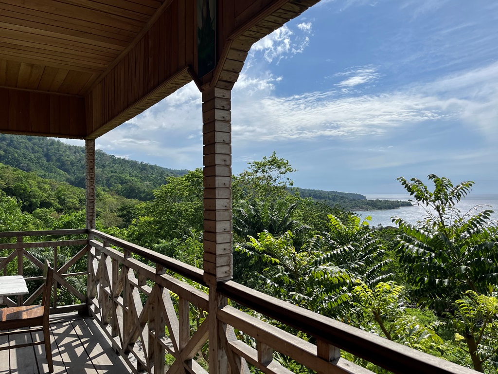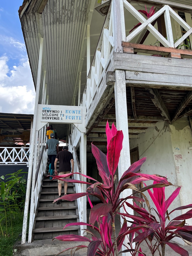 Após isso fizemos mais um pequeno percurso de jipe, para chegar à Roça Monte Forte. Aí almoçámos no restaurante da Roça do qual se tinha uma vista fabulosa para uma paisagem verdejante diversificada e para o mar que completava o cenário.