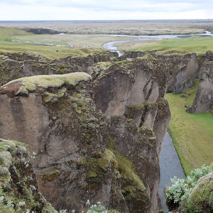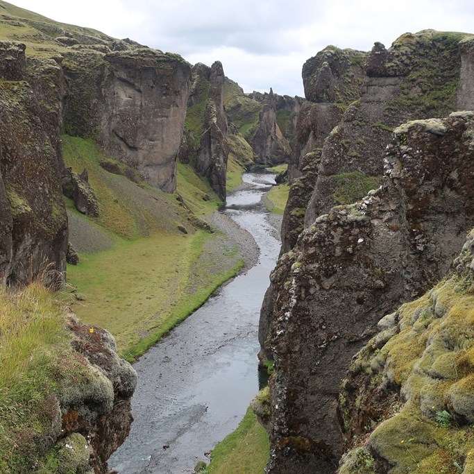 Fjaðrárgljúfur (não muito longe da vila de Kirkjubæjarklaustur) é um desfiladeiro no sudeste da Islândia, apresentando paredes íngremes e águas sinuosas do rio Fjaðrá, que flui ao longo dele. Tem 100 m de profundidade e (cerca de) 2 quilómetros de comprimento. Vale a pena a paragem!
