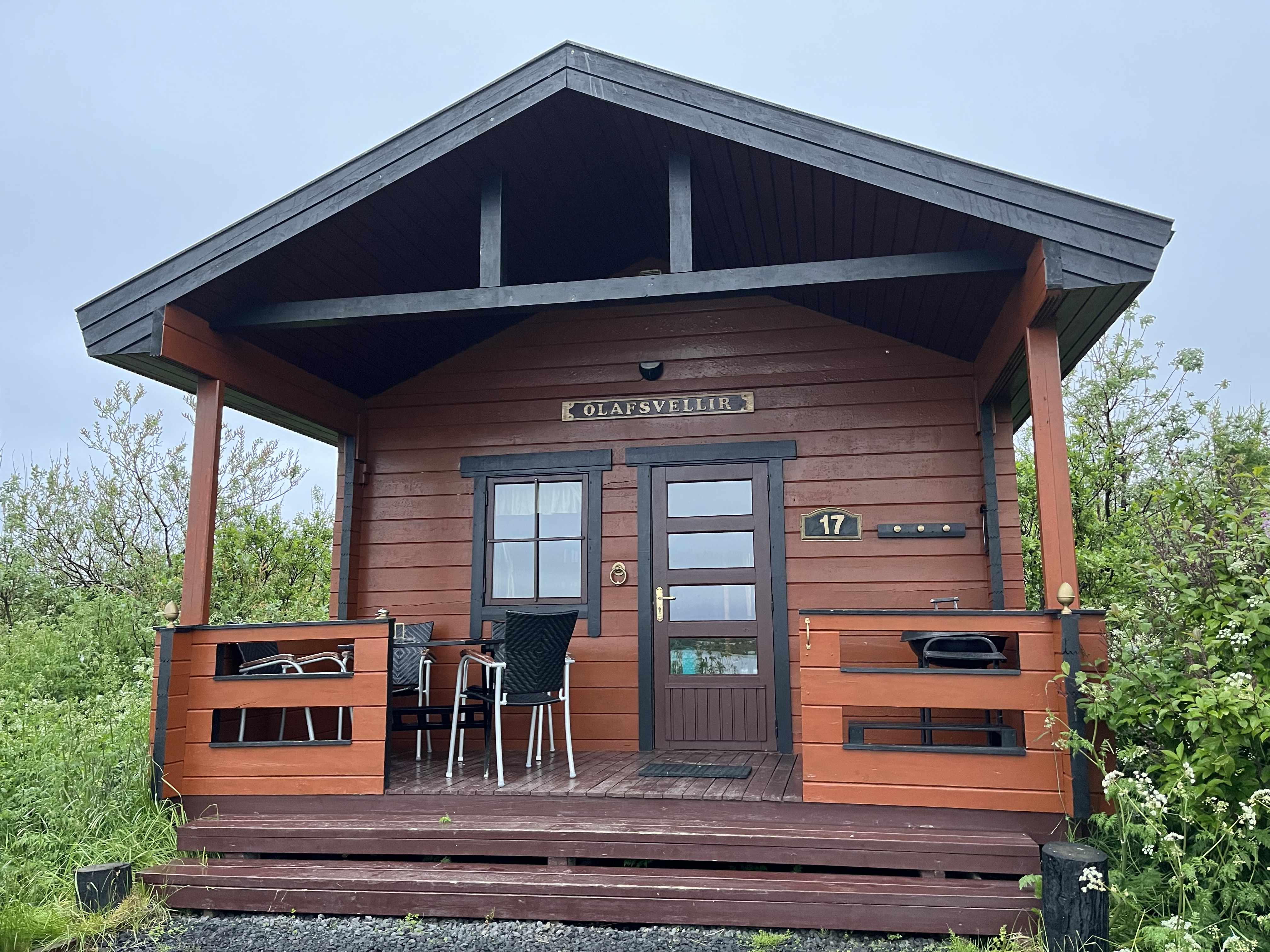 Foi um fim de dia fabuloso! O nosso alojamento era uma tiny house de madeira numa localização indescritível – à beira da água e com a montanha ao fundo com algum gelo!