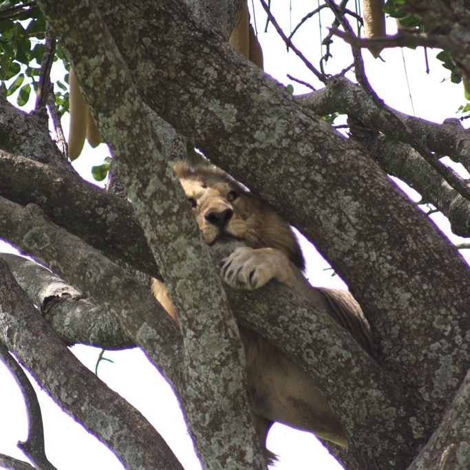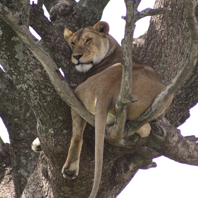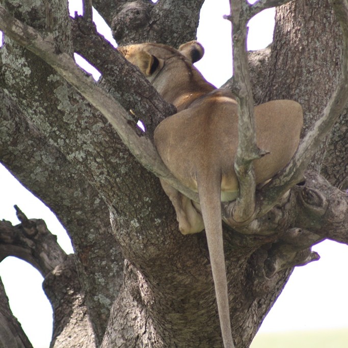 Ela servia de poiso a uma família leonina! Sentíamo-nos numa sala de cinema ao ar livre para assistir a cenas dos próximos capítulos, mas o filme não desenvolvia! Víamos alguns vultos que nos pareciam corresponder a leoas nos seus tronos – troncos que serviam para descansar o corpo, tendo as patas e a cauda pendentes.
