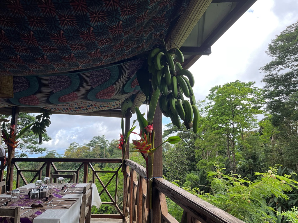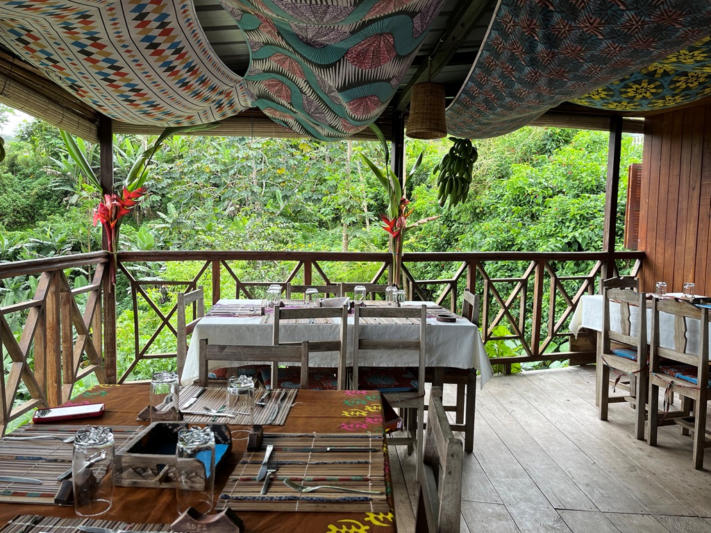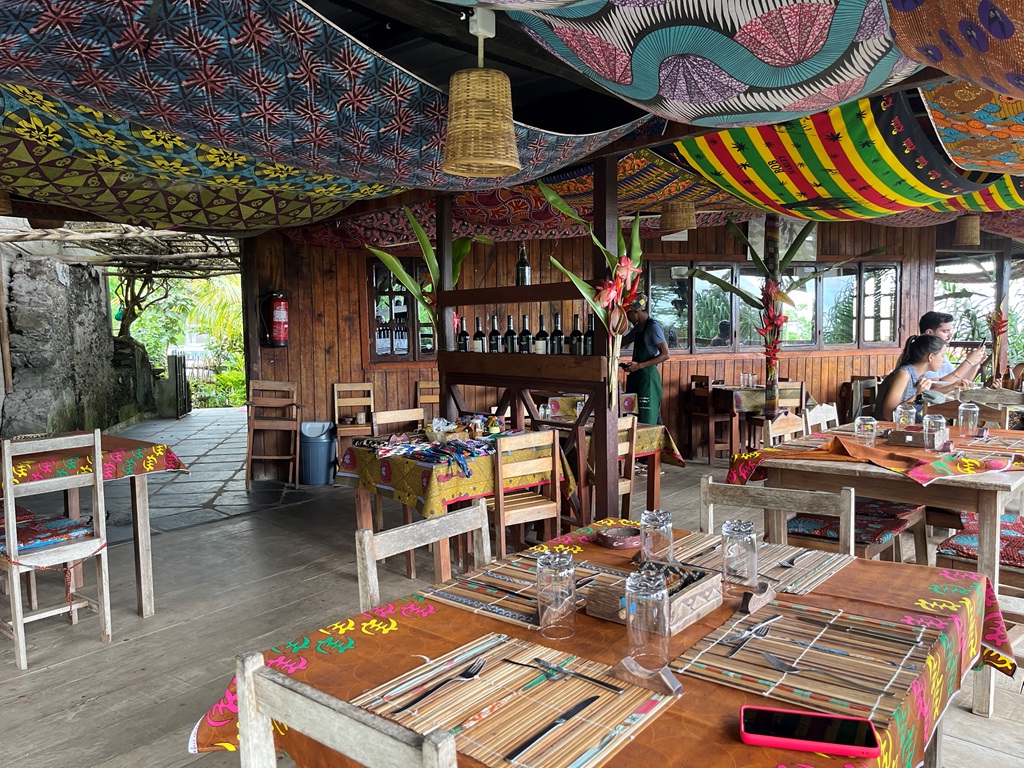 O espaço do restaurante estava decorado com panos típicos de cores alegres e desenvolvia-se numa zona alta tendo uma paisagem deslumbrante no meio de vários tons de verde oferecidos pela variedade de árvores e arbustos, o que dava um cariz de descontração e bem estar.
