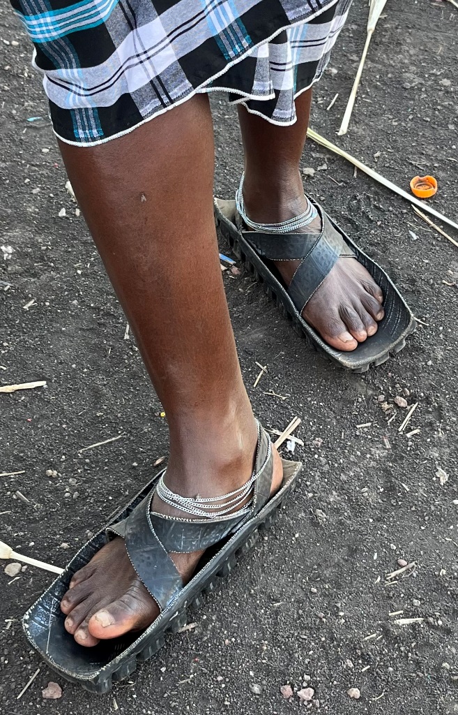 Os Maasais são, assim, conhecidos pelas suas túnicas, tradicionalmente, vermelhas e quadriculadas mas não só! É interessante observar o seu calçado! Fazem os seus chinelos aproveitando pneus.